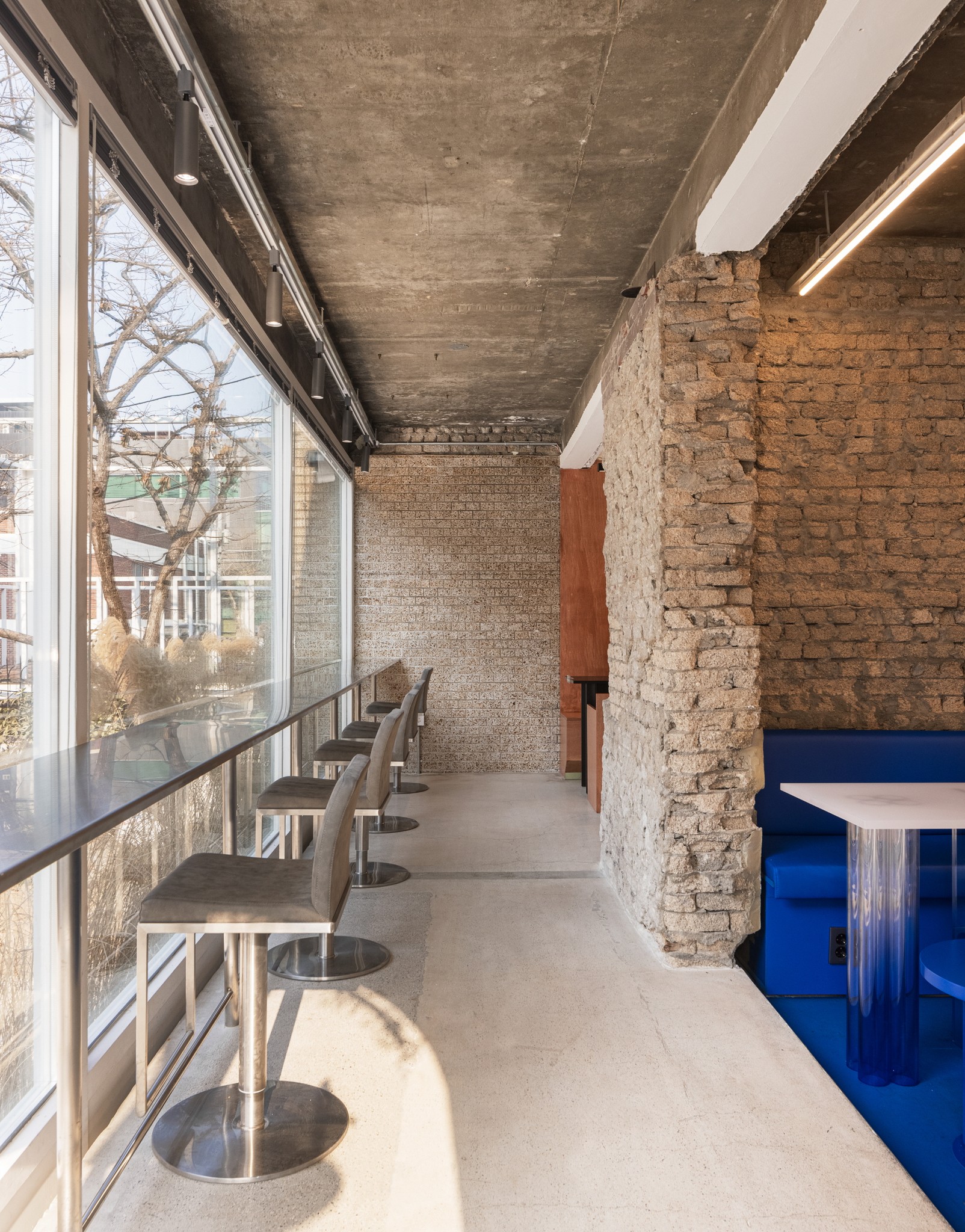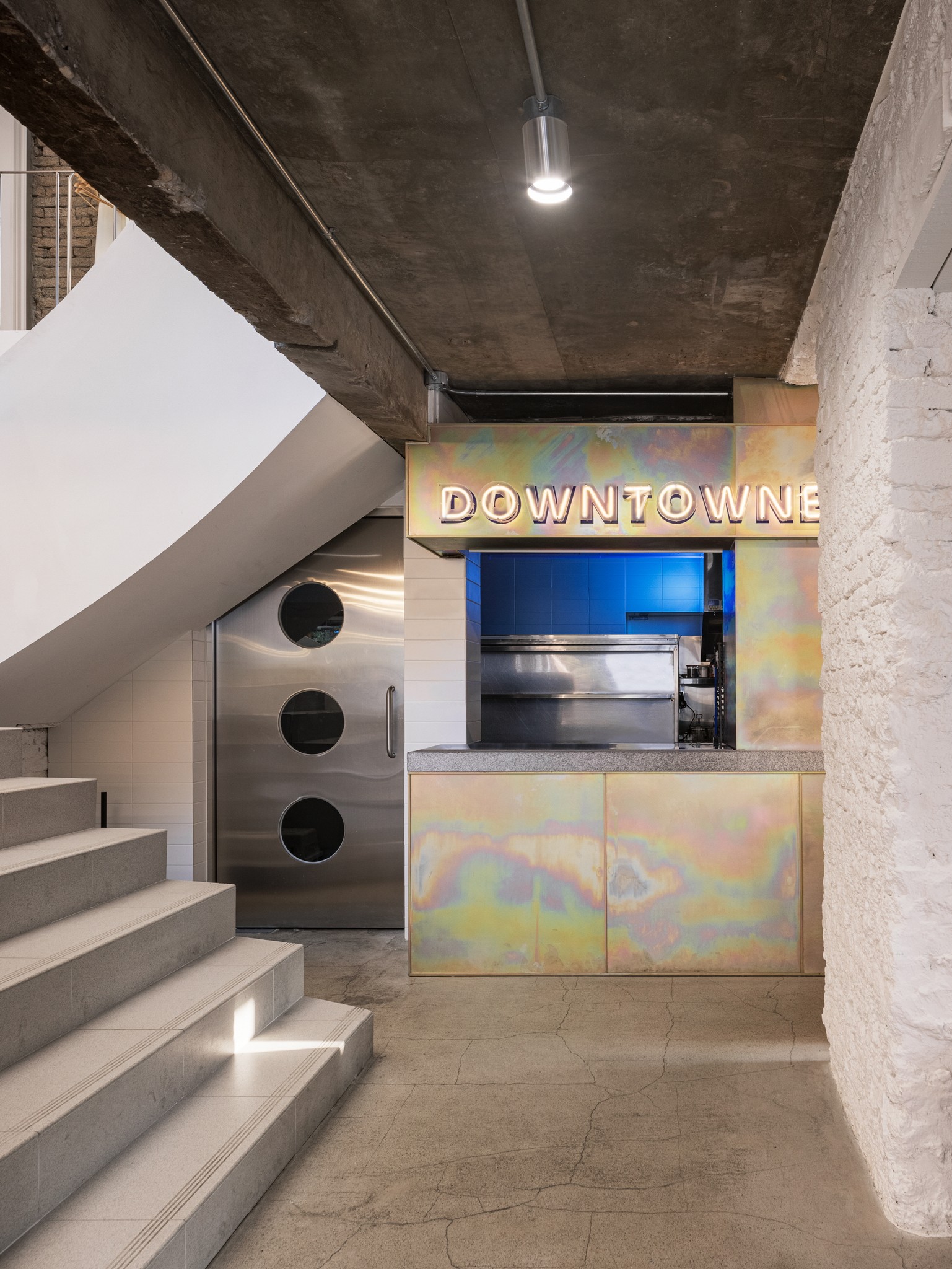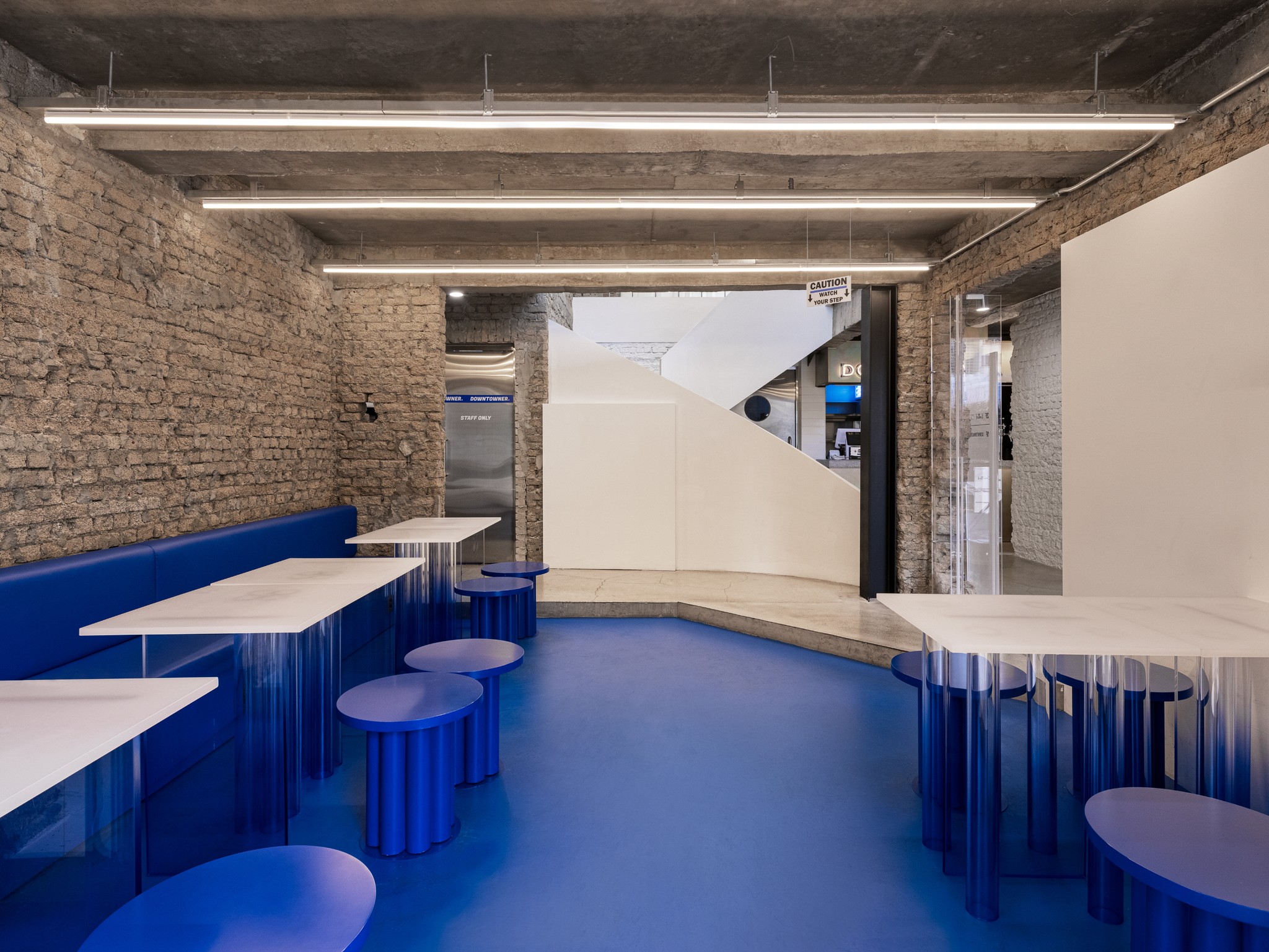 Rough brick walls, exposed concrete, and structural elements are left visible throughout, revealing the accumulated layers of the building’s past. Within this framework, each floor is articulated differently. The ground floor, occupied by Downtowner, introduces a bold blue palette and translucent materials to create a direct and energetic atmosphere, while the upper floor, housing Knotted, adopts a lighter and more restrained tone, forming a softer and more relaxed impression.