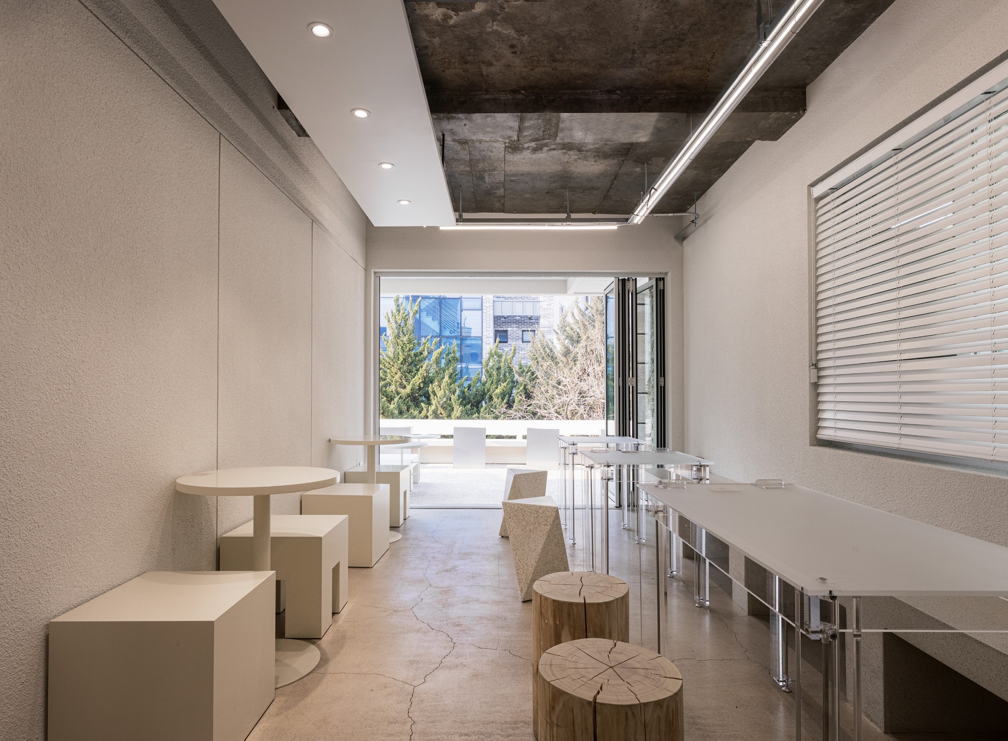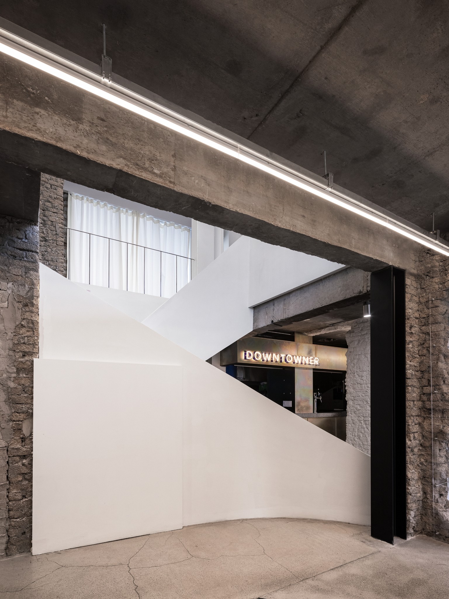 중앙에 위치한 계단은 두 공간을 연결하는 동시에, 서로 다른 분위기가 전환되는 지점으로 작동한다. 흰색의 곡면으로 정리된 계단은 거친 구조 사이에서 또 하나의 레이어로 개입하며, 공간의 흐름을 명확하게 드러낸다.
