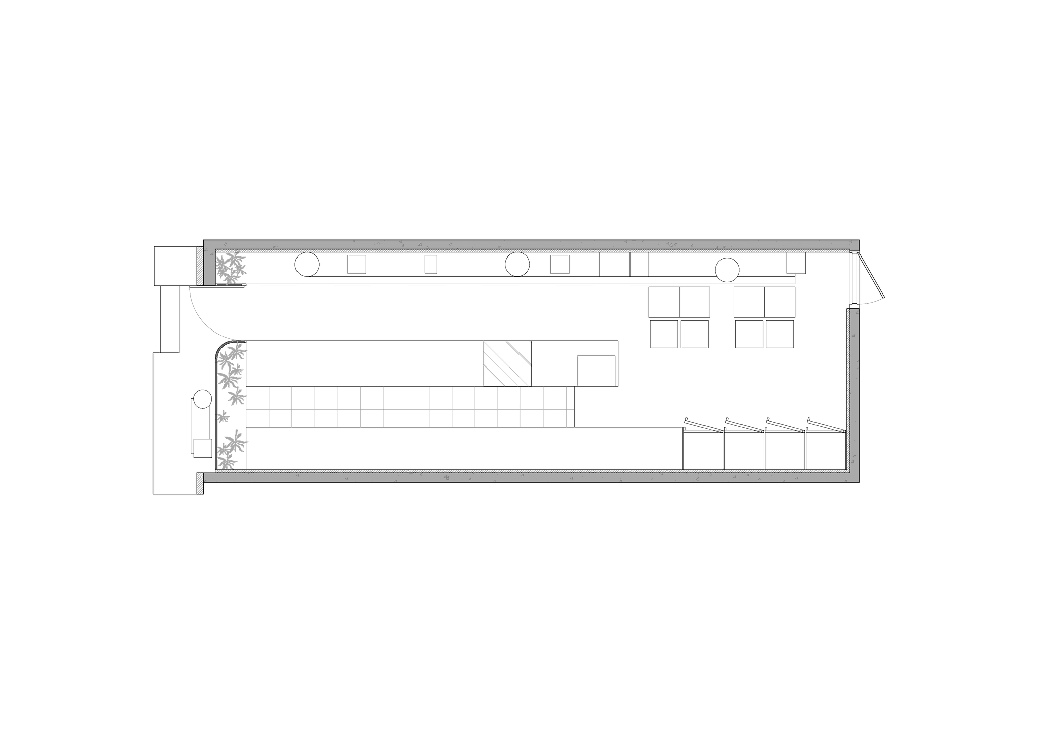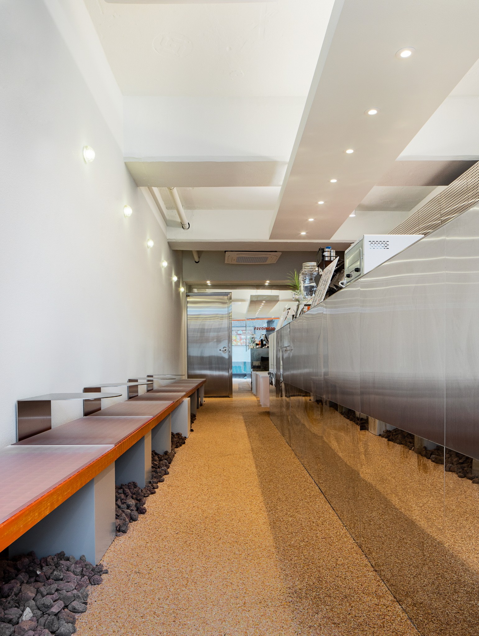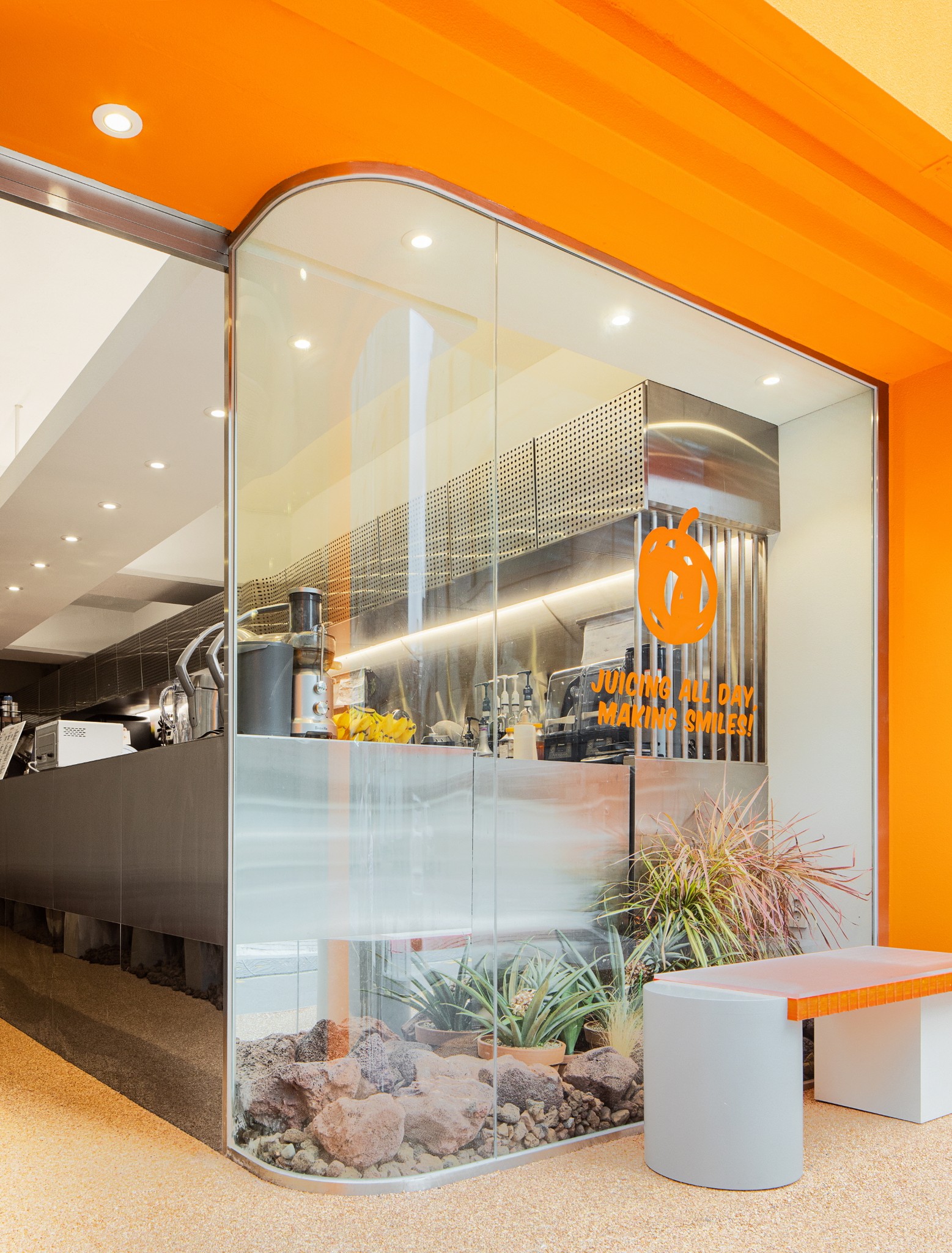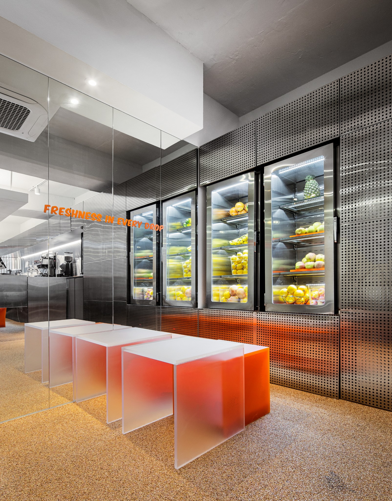 Jujumama is a juice bar centered on fresh fruit juices, where the spatial impression is constructed through the contrast of materials.