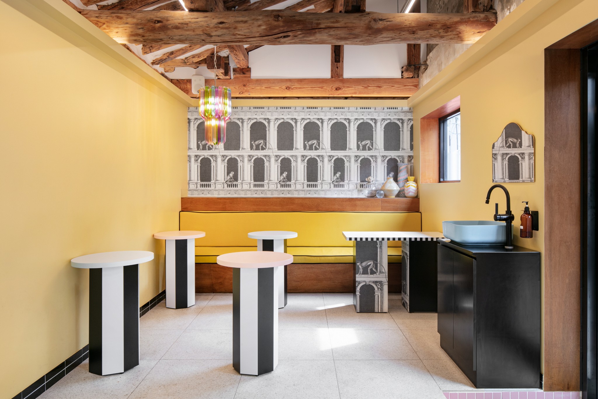 브랜드 컬러인 노랑은 공간 전반에 적용되어 작은 규모 안에서도 강한 시각적 밀도를 만든다. 벽과 가구에 사용된 그래픽 패턴과 캐릭터 요소들은 공간의 분위기를 직관적으로 드러내는 장치로 작동한다.