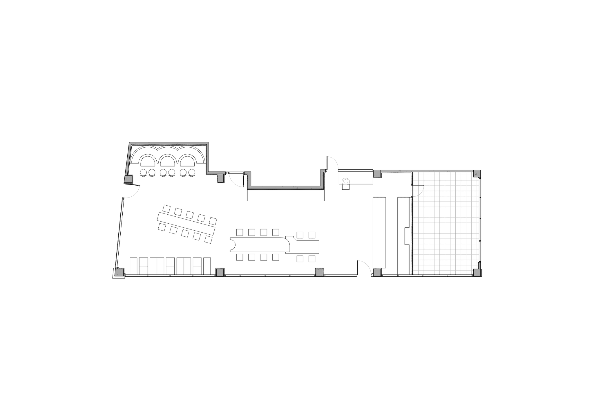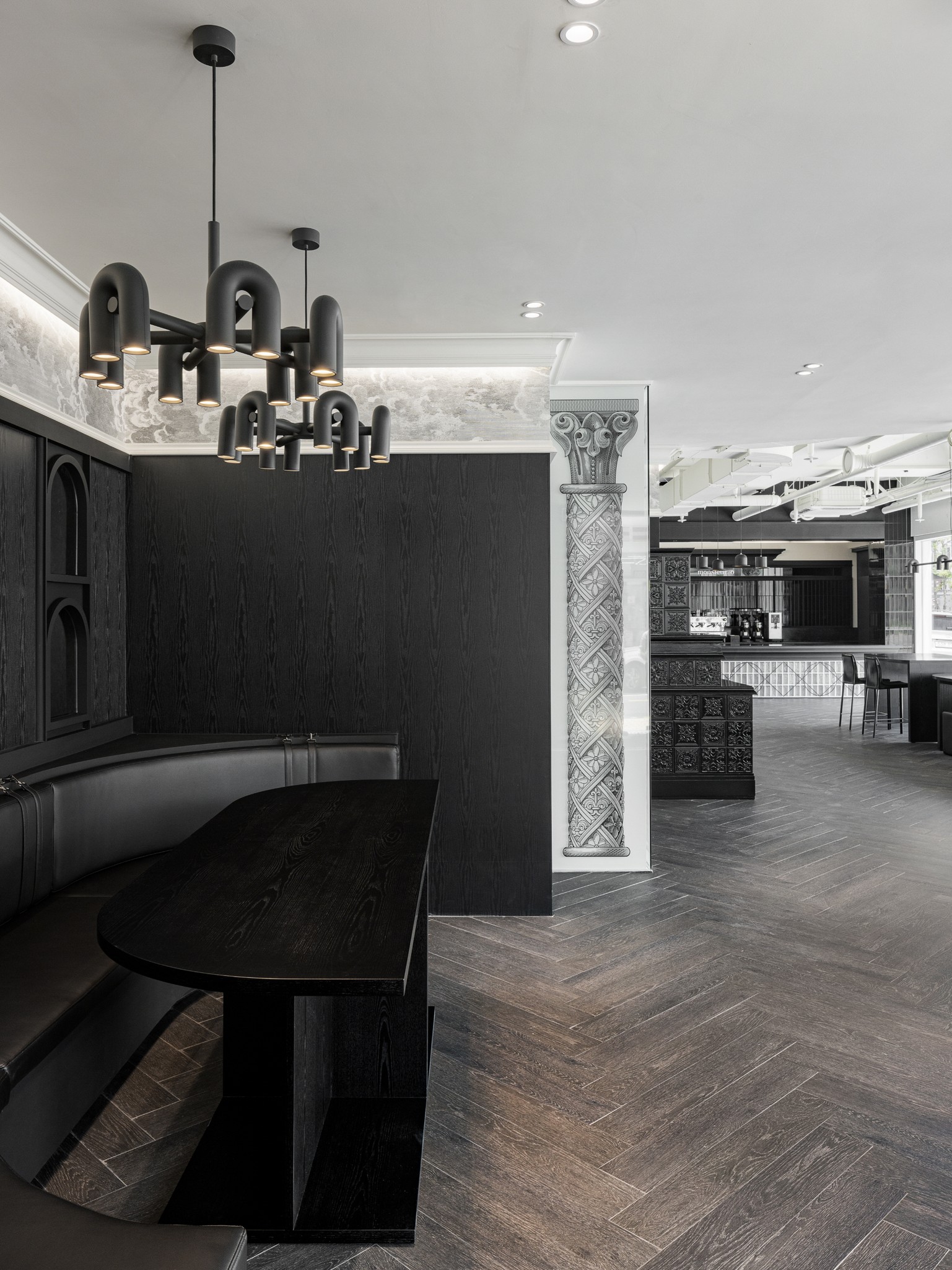 중앙의 바와 긴 테이블은 공간의 흐름을 정리하는 중심축으로 작동하고, 반복되는 패턴과 요소들은 시선의 방향을 따라 공간을 하나의 연속된 장면으로 이어준다.