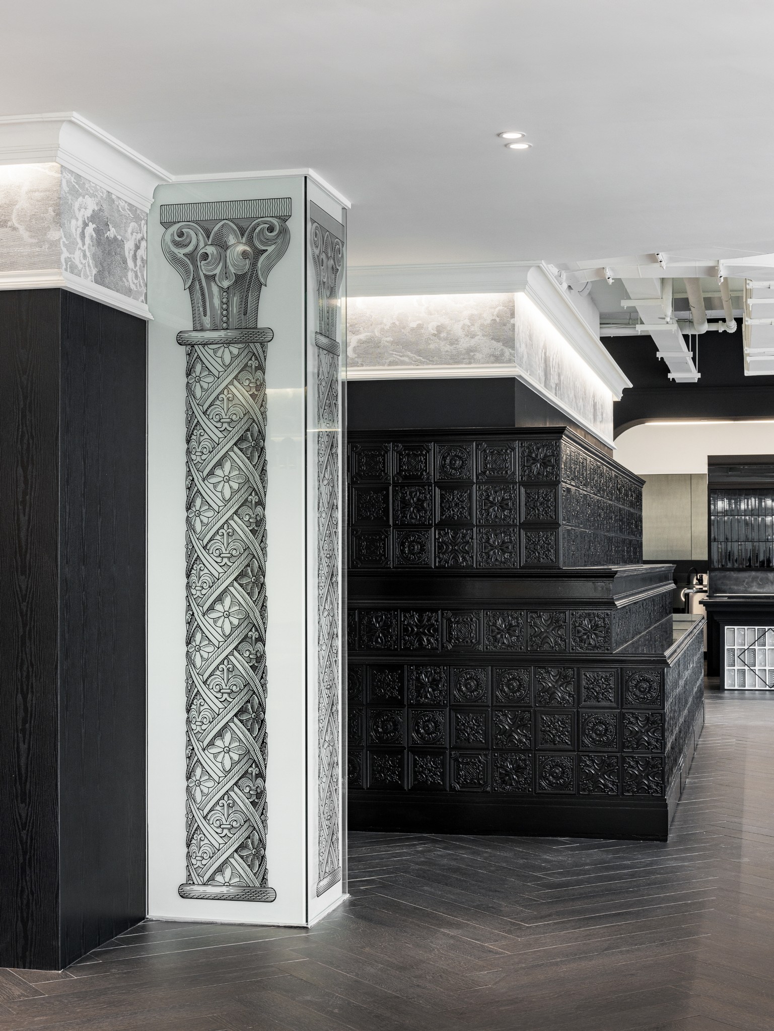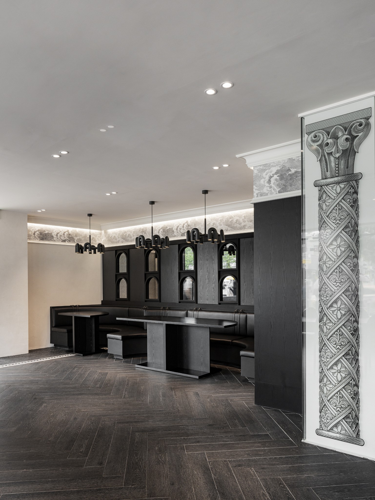 공간 전반에는 몰딩, 패턴 타일, 기둥 장식과 같은 클래식한 요소들이 반복적으로 등장하며, 하나의 일관된 질서를 만든다. 이들은 단순한 장식에 머무르지 않고, 공간의 리듬과 깊이를 형성하는 구조로 작동한다.