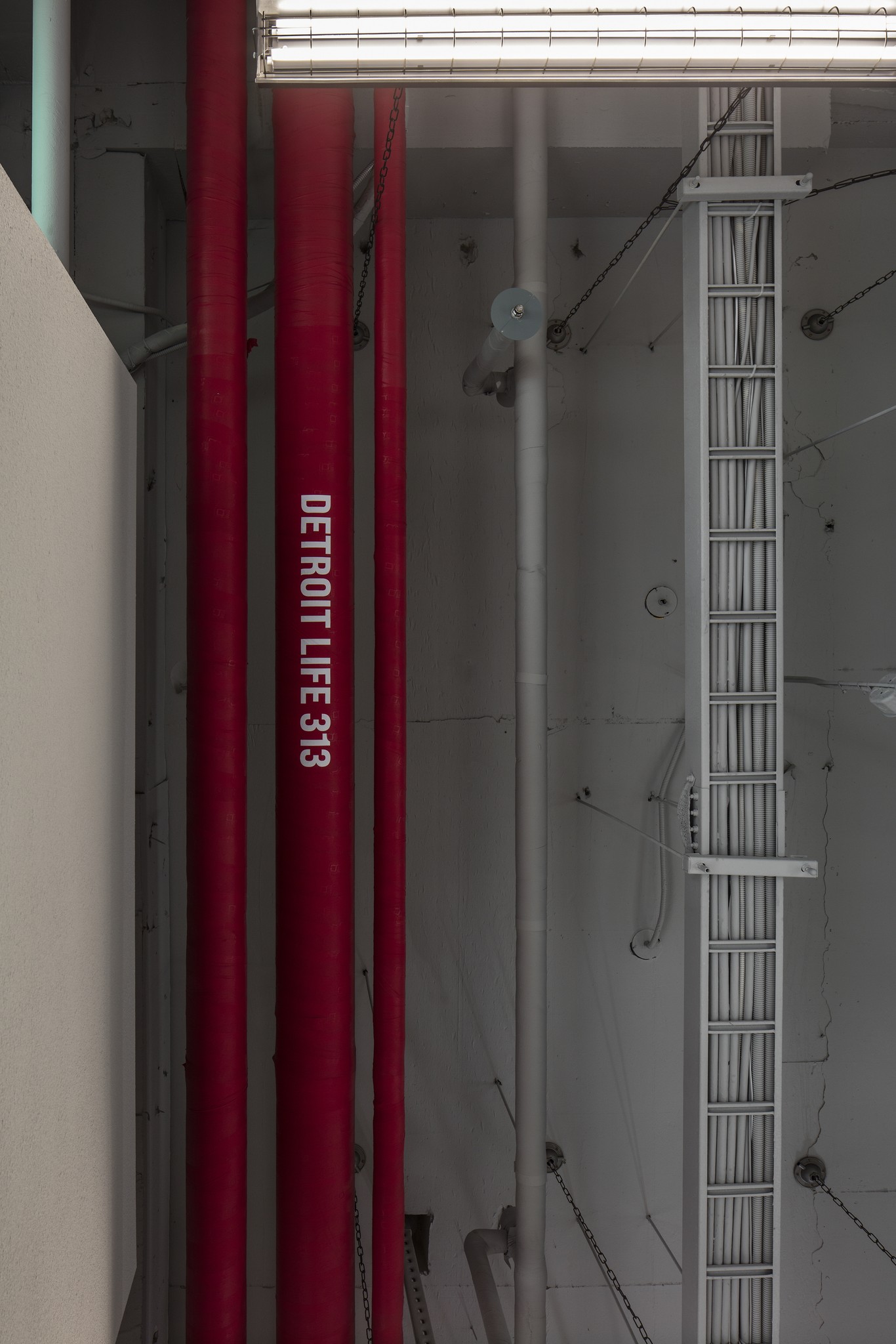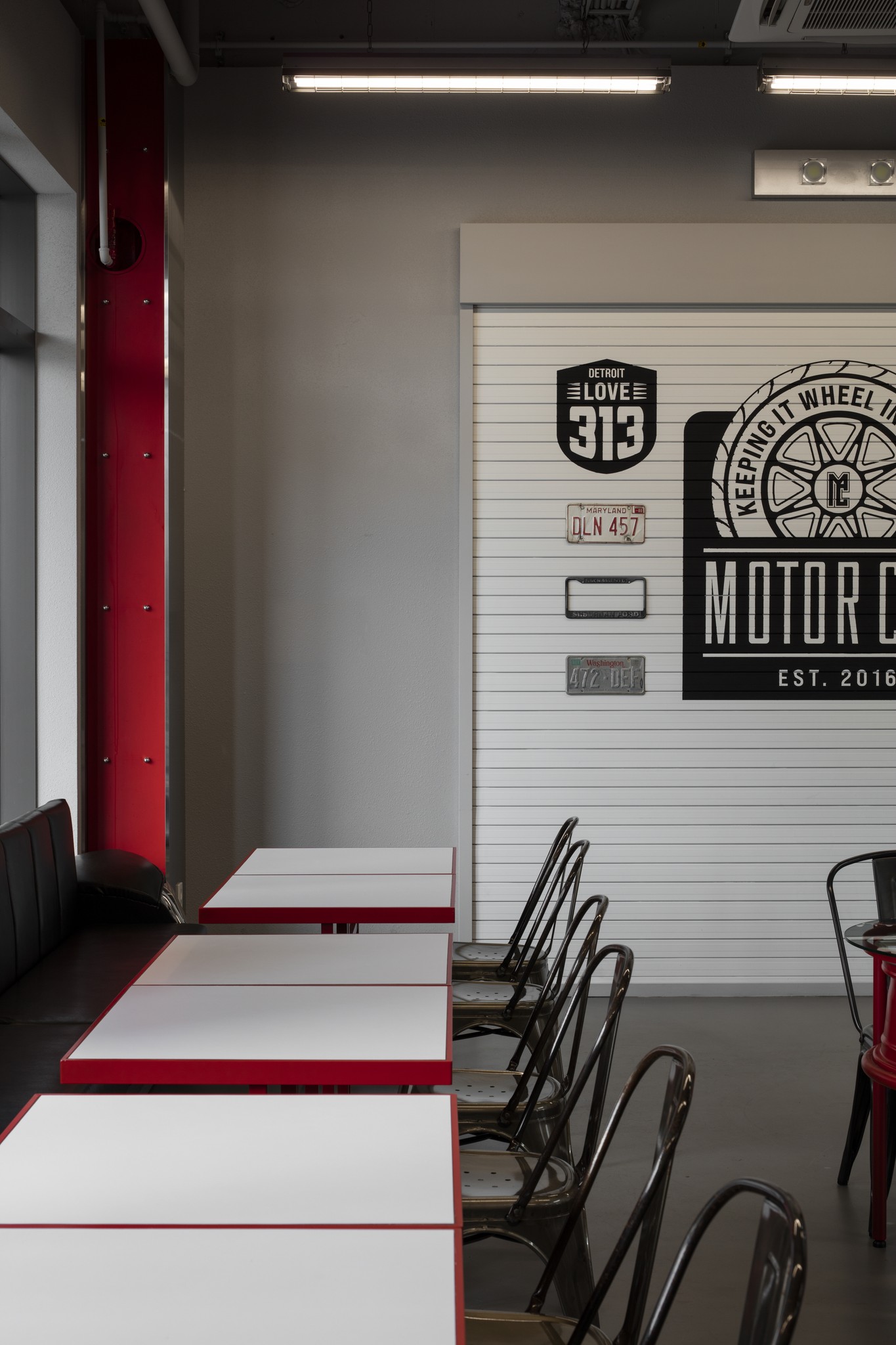 벽면 그래픽과 타이포그래피는 디트로이트라는 도시와 자동차 산업의 정체성을 직접적으로 반영하며, 공간에 명확한 방향성을 부여한다.