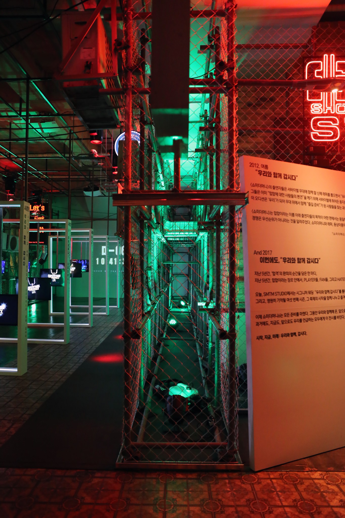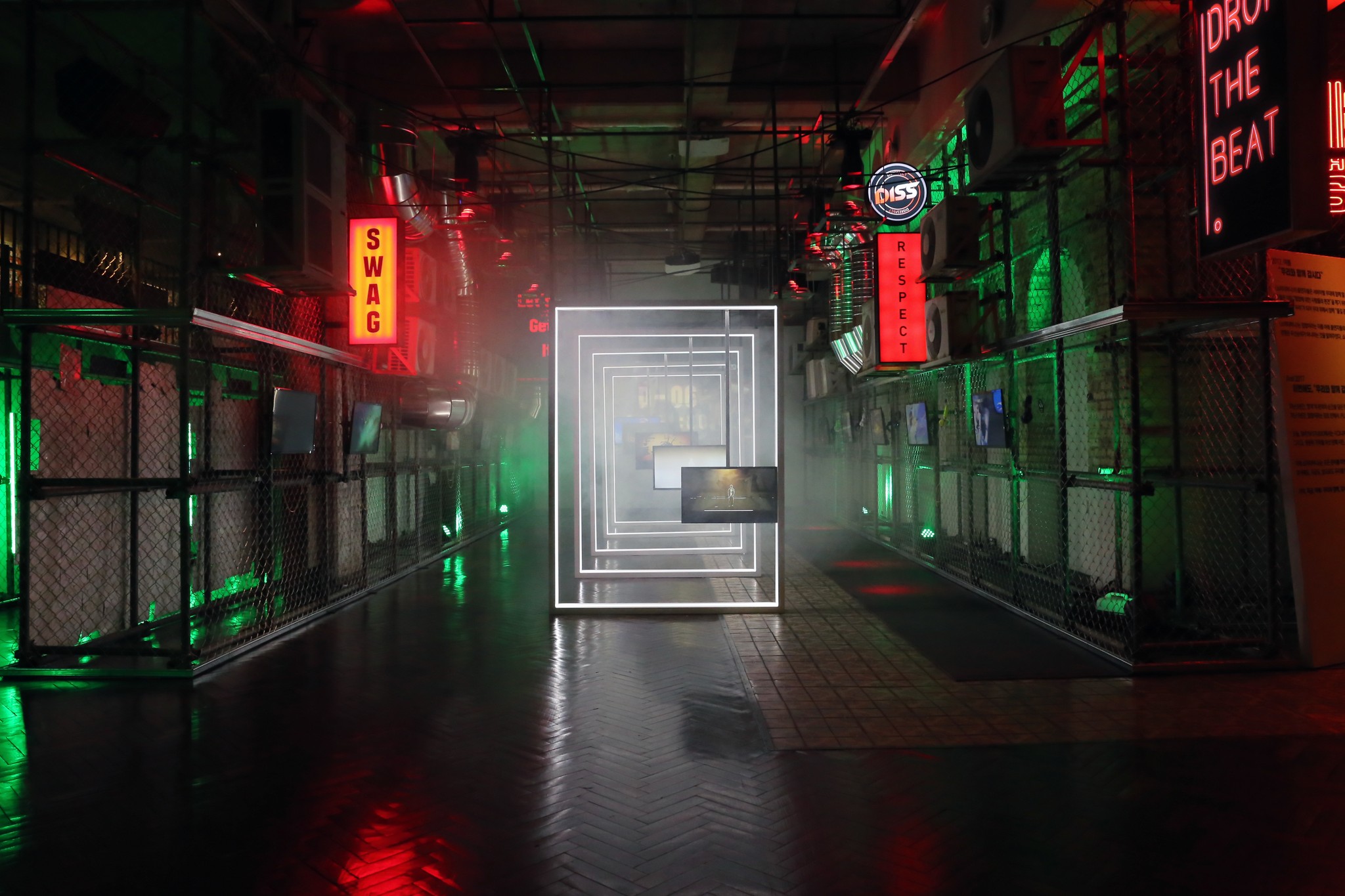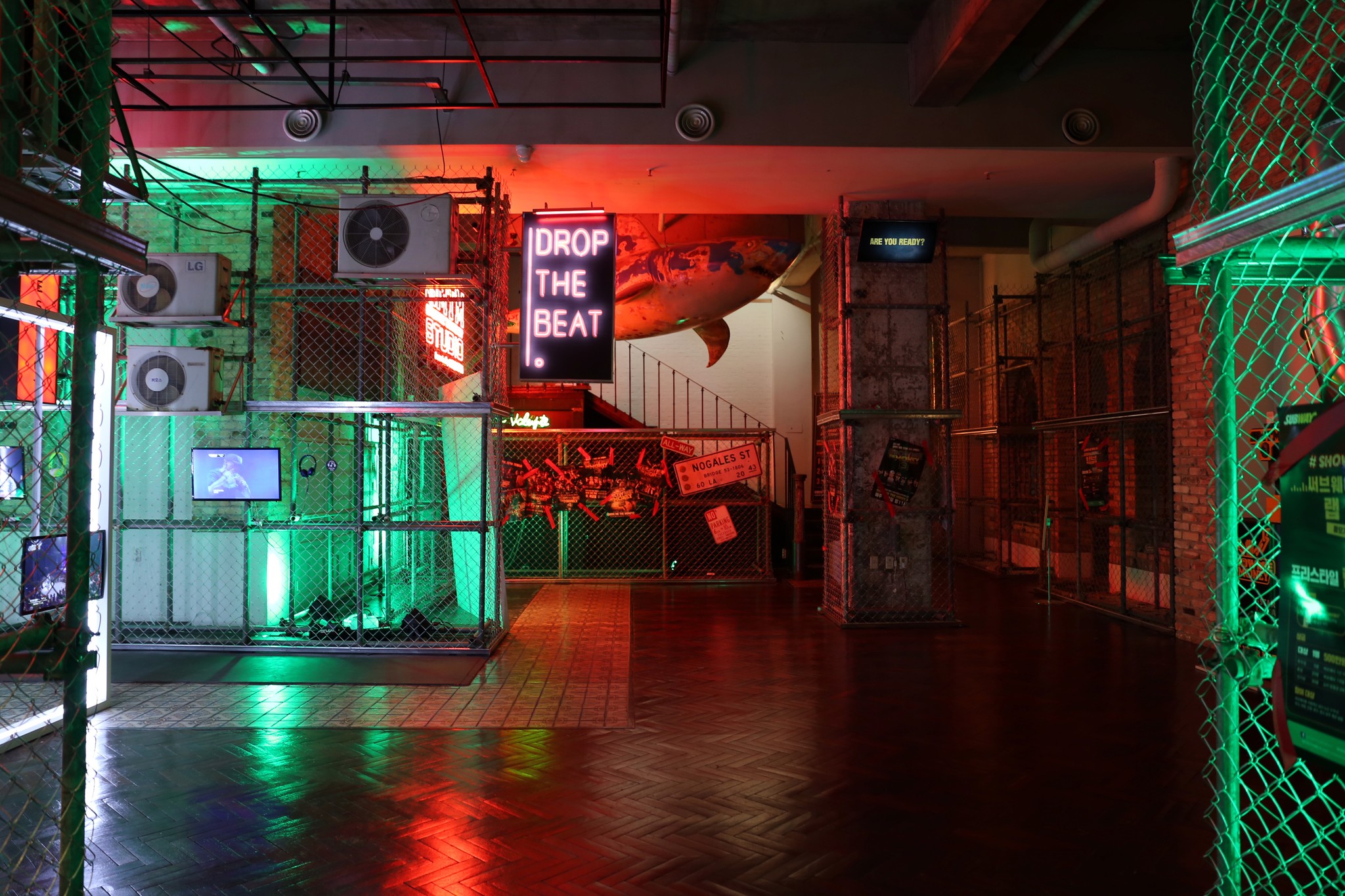 각 요소는 기능적인 장치이면서 동시에 장면을 구성하는 매개로 작동한다. 간판의 문구는 프로그램에서 반복적으로 등장하는 언어를 차용하고, 영상은 특정한 위치에 노출되며, 방문자는 이를 지나치듯 마주하게 된다. 중앙에 배치된 영상은 시즌 1부터 5까지의 장면이 겹쳐지듯 이어지며 흐르고, 그 끝에서 시즌 6의 프리뷰가 드러나도록 구성되어 전시의 흐름을 이어간다. 이러한 구성은 의도된 연출을 통해 거리에서 콘텐츠를 마주하는 경험을 재현한다.
