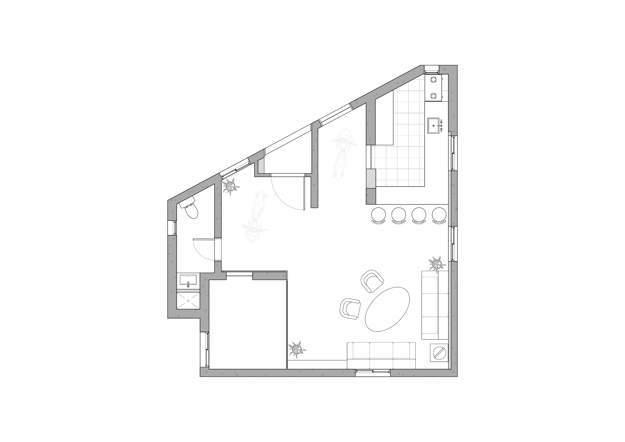 The space is composed as a condition where work, rest, gathering, and parties coexist, with each element existing within a continuous flow rather than being separated. As people stay and relationships accumulate over time, the space gradually forms its own distinct atmosphere.