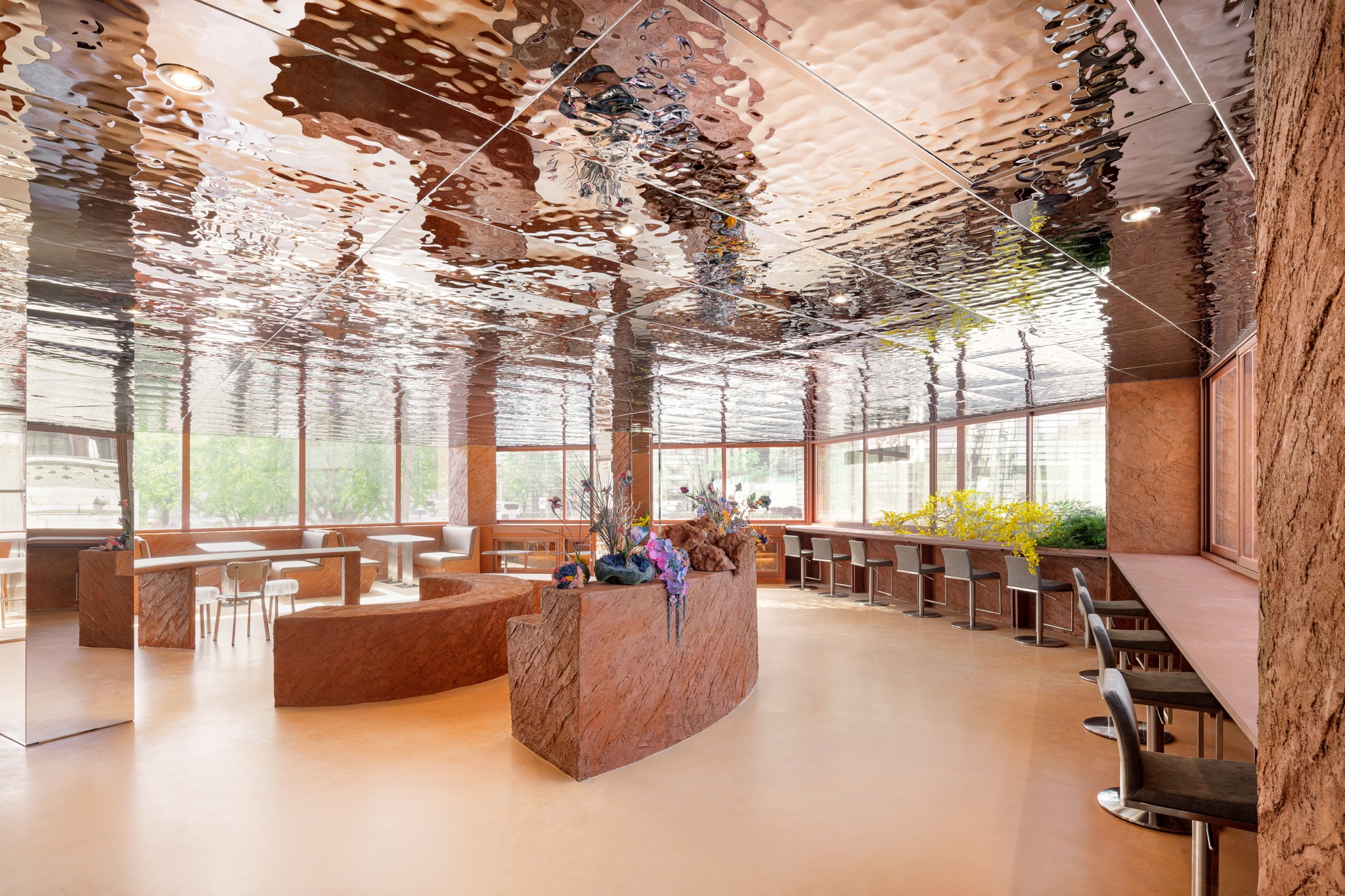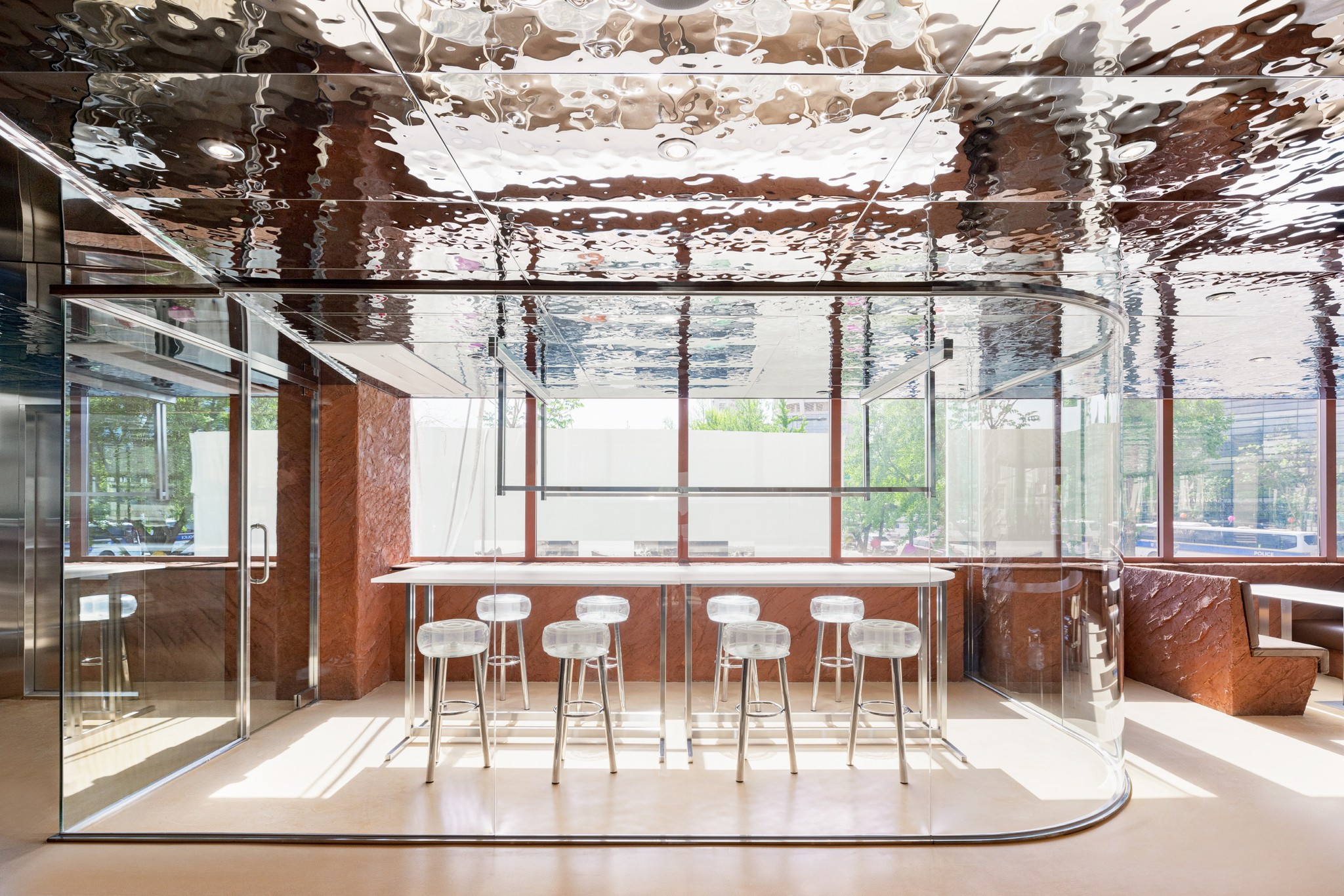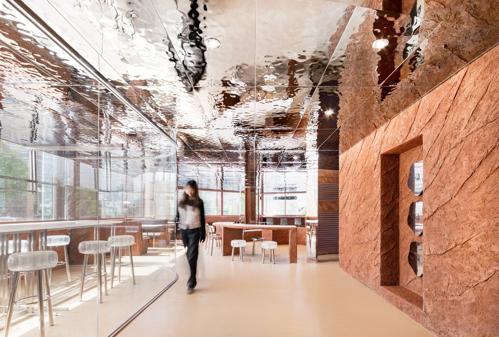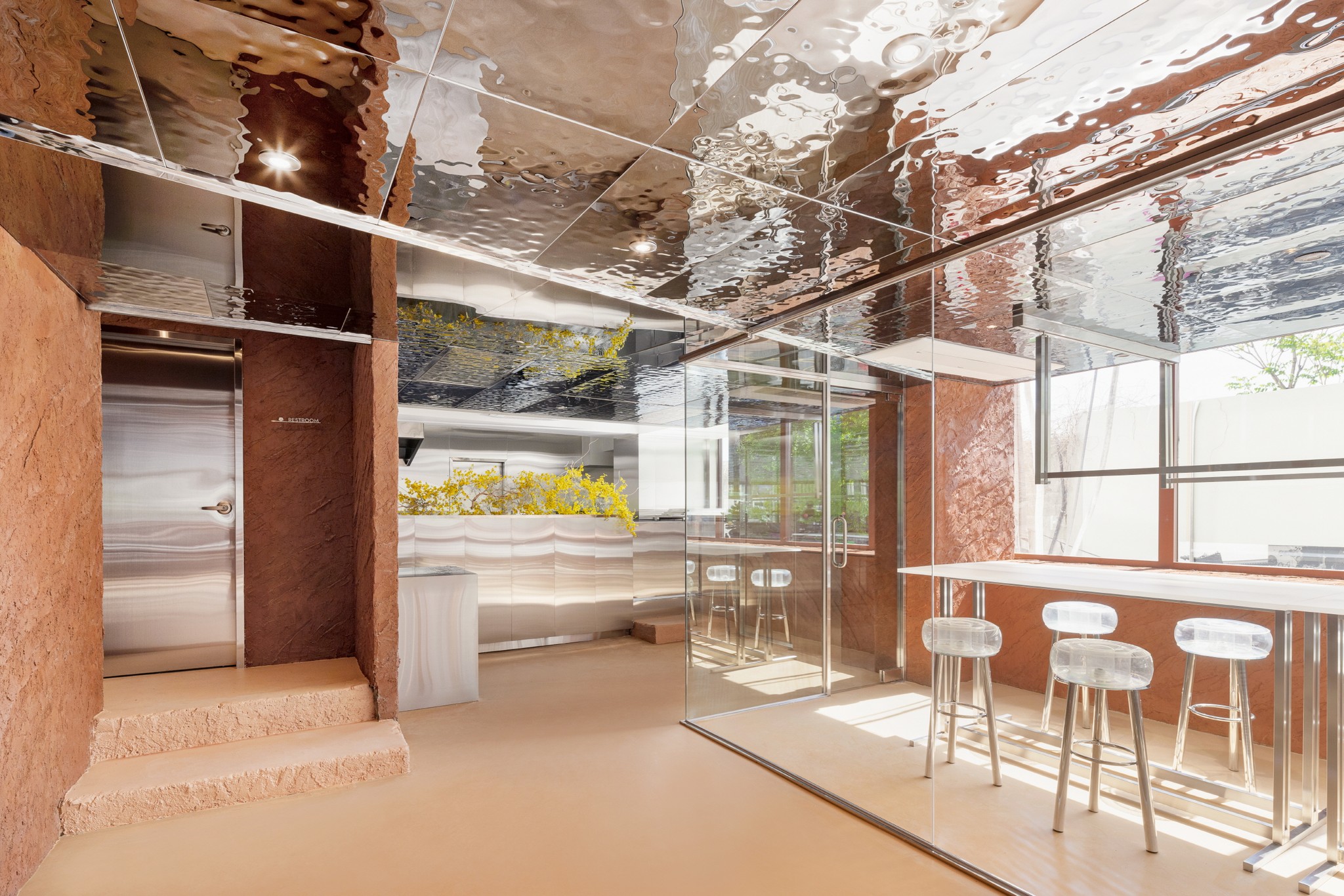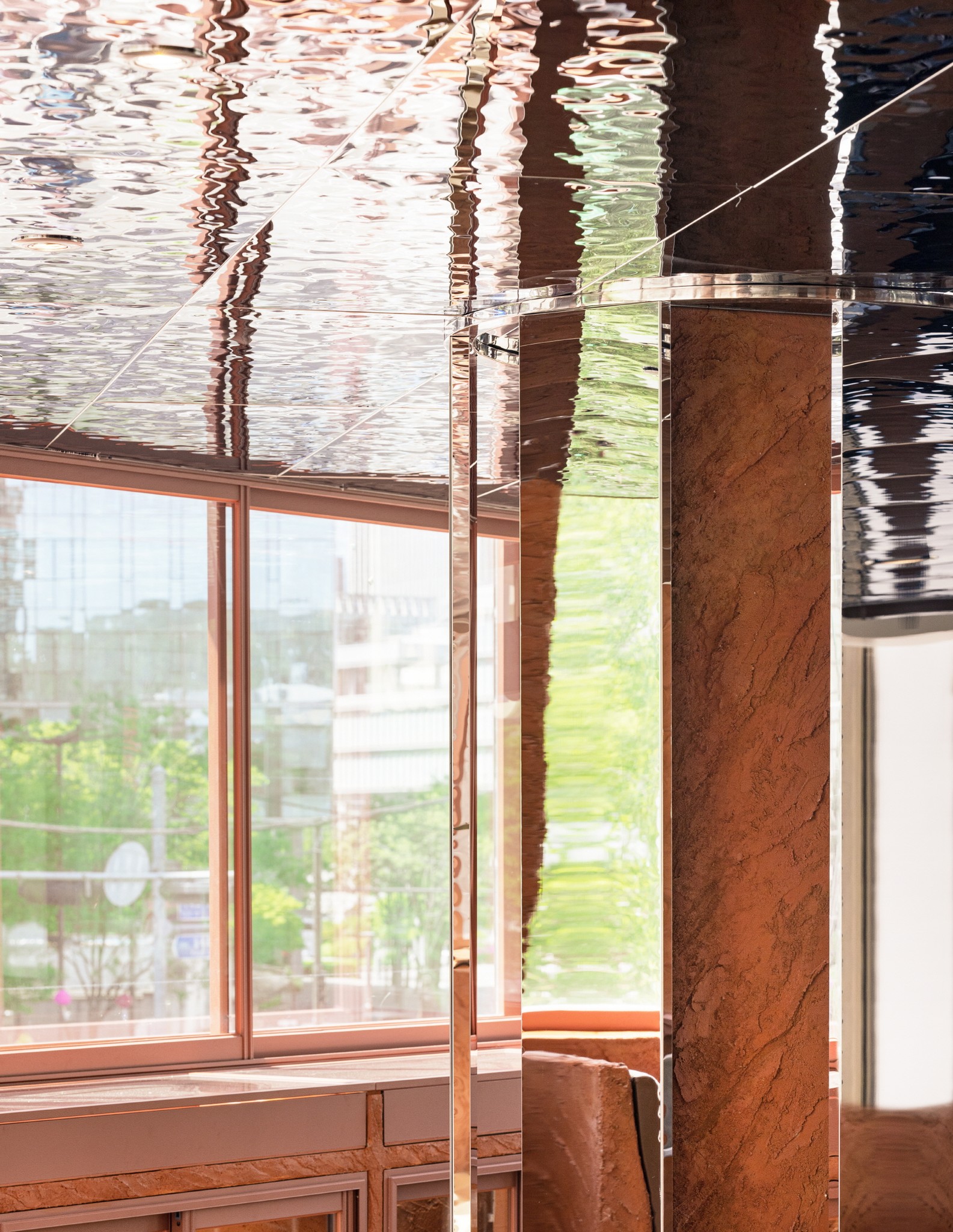 The floor and walls are finished with textured coatings and pigmented concrete, evoking the qualities of soil and allowing the space to be perceived as a continuous terrain. Above, the ceiling composed of water-wave panels reflects light and surrounding elements, suggesting the flow of water. These contrasting conditions overlap to establish the fundamental environment of the space.