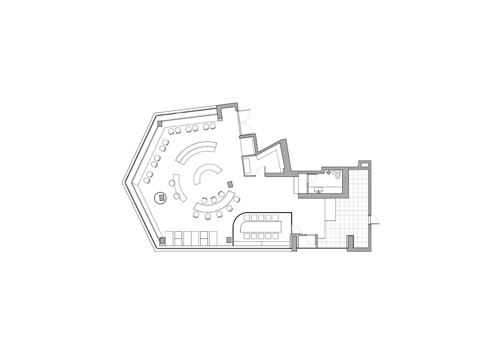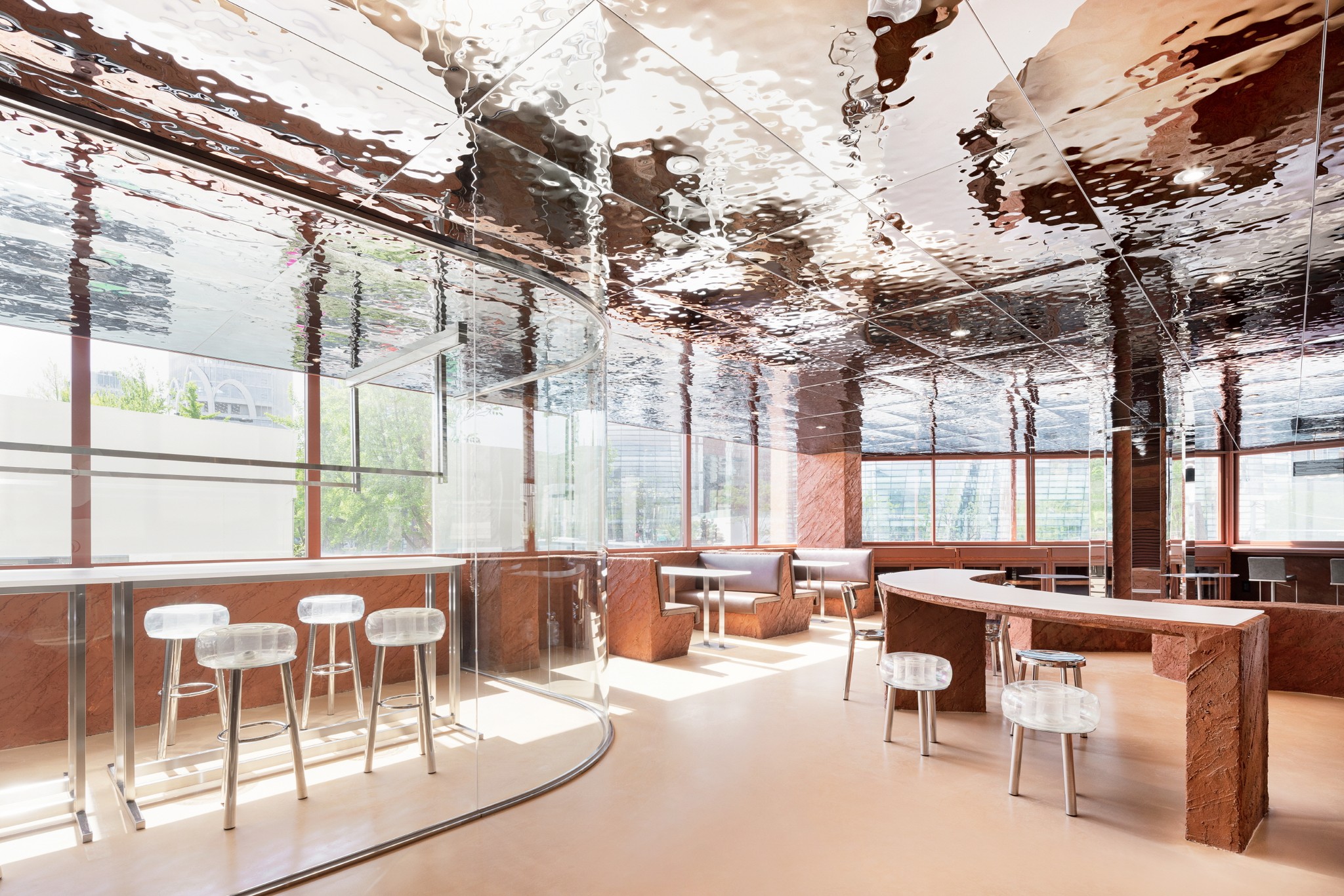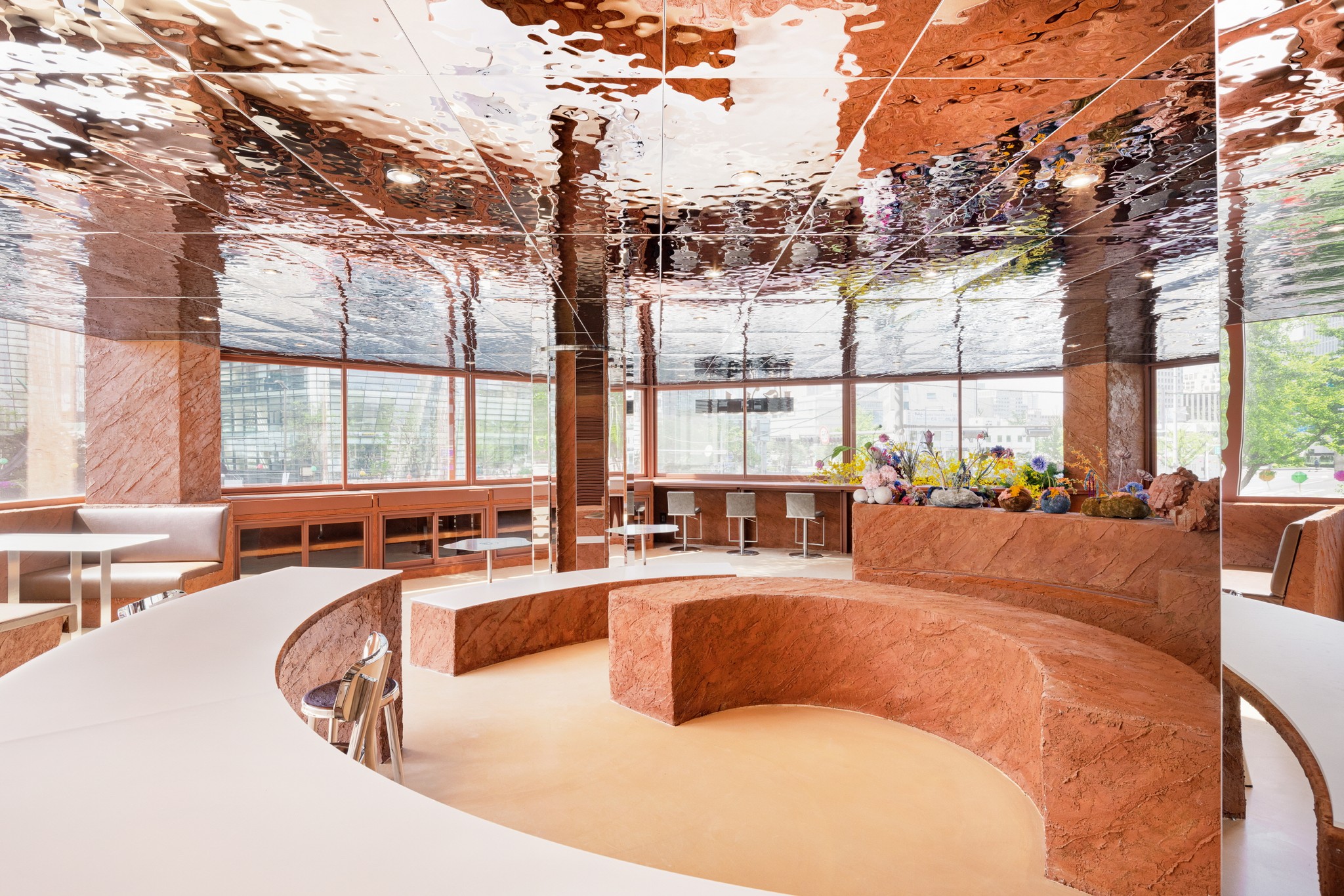 레이아웃은 물 위에 떨어진 한 방울의 파장이 퍼져나가는 형태를 바탕으로 방사형으로 전개되며, 좌석과 테이블, 꽃을 위한 요소들은 개별 오브젝트가 아닌 지형에서 자연스럽게 드러난 형태로 구성된다. 중앙에 놓인 꽃은 공간의 기준점이 되며, 유리로 구성된 클래스 공간은 시각적으로 열려 있어 꽃을 다루는 과정까지 하나의 장면으로 이어진다.