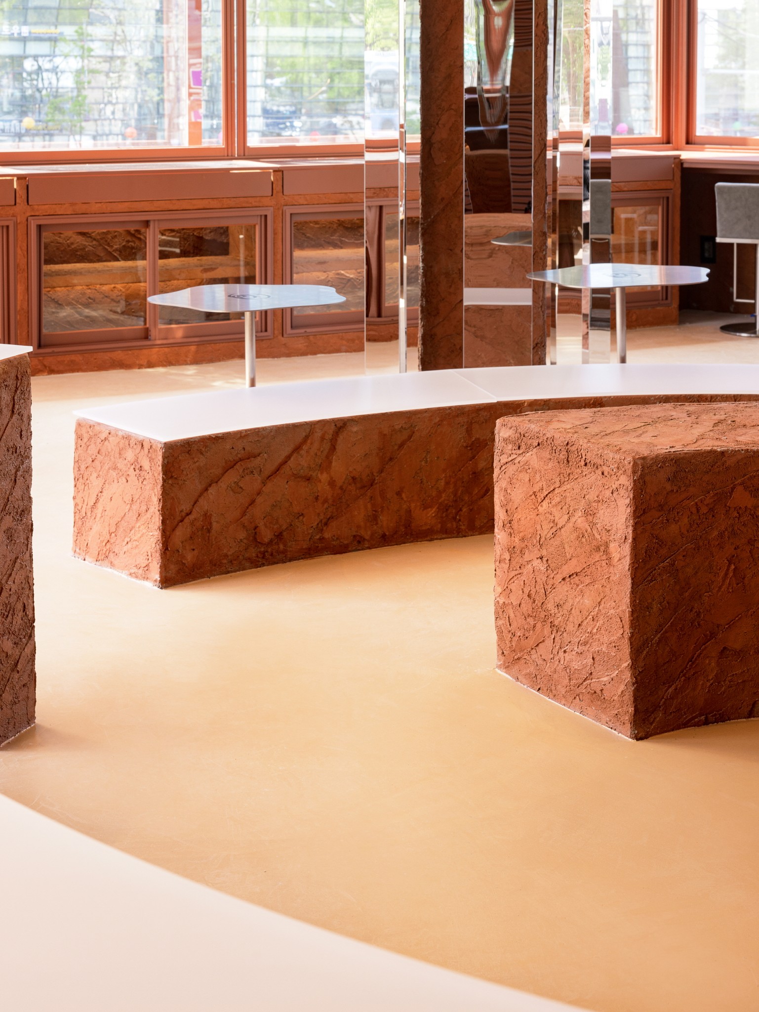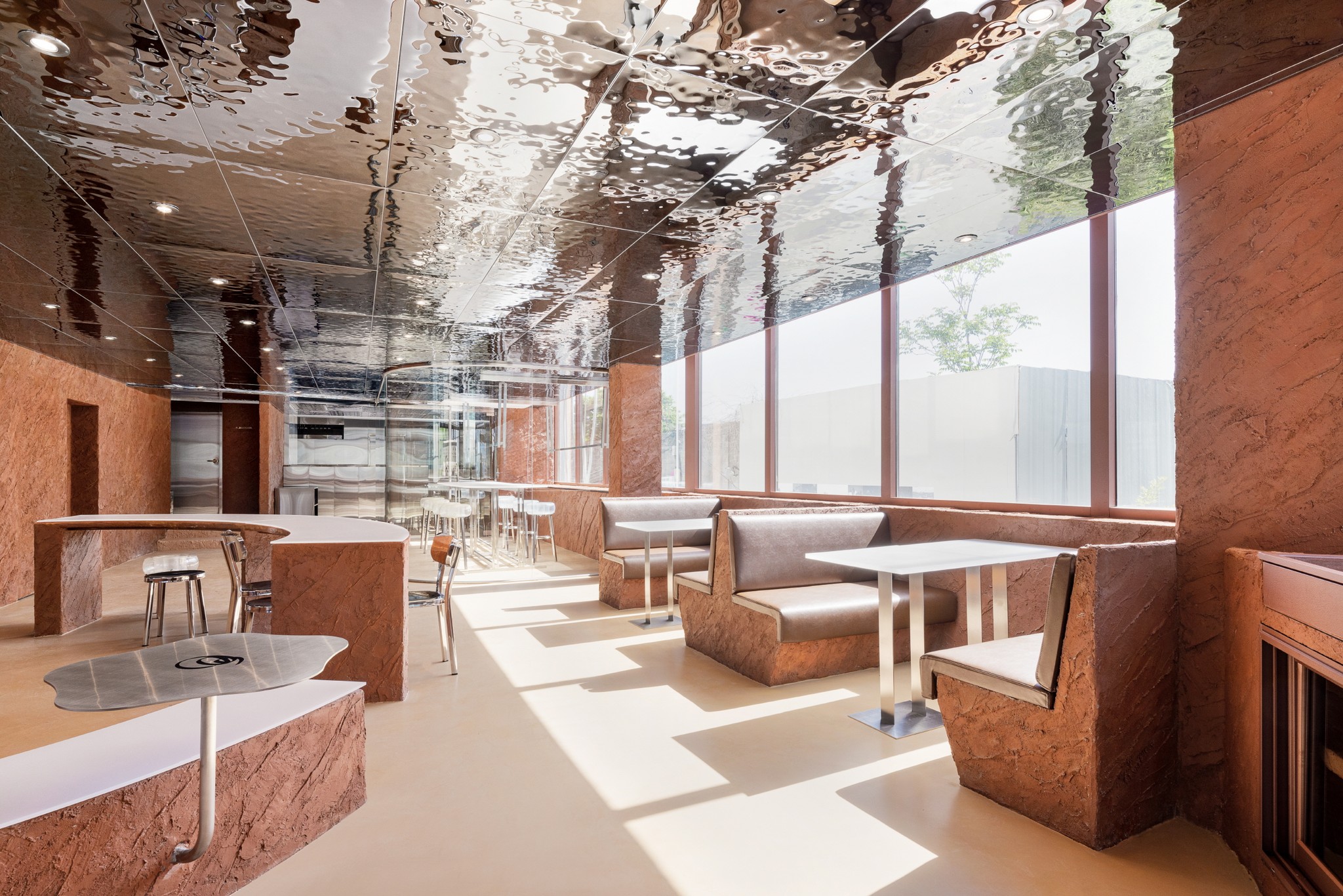 바닥과 벽은 흙의 질감을 연상시키는 텍스처 도장과 컬러 콘크리트로 구성되어, 공간을 하나의 지형처럼 인식하게 만든다. 그 위에 워터웨이브 패널로 이루어진 천장은 빛과 주변 요소를 반사하며 물의 흐름을 암시하고, 서로 다른 성질의 두 요소가 겹쳐지며 공간의 기본적인 조건을 형성한다.