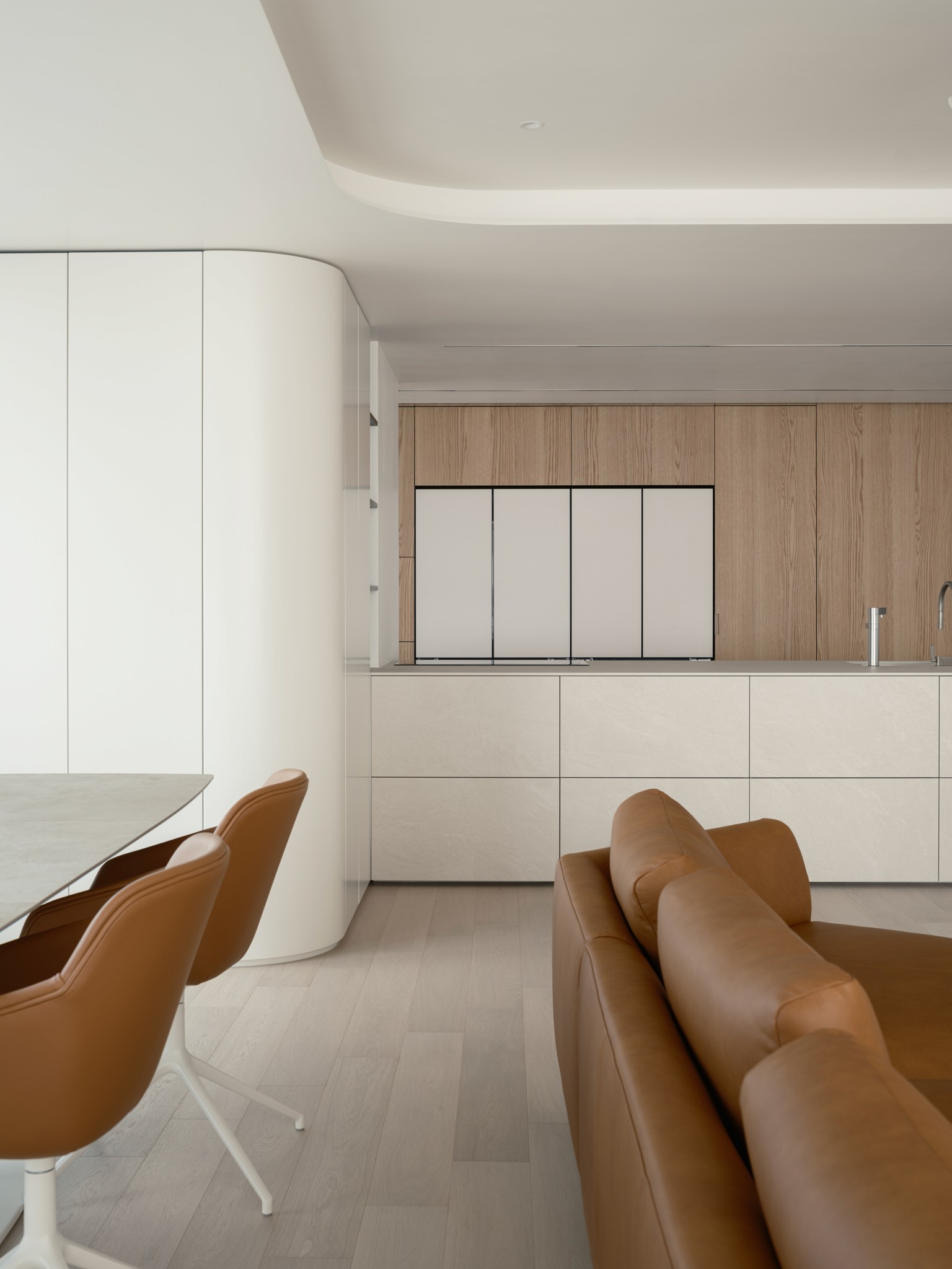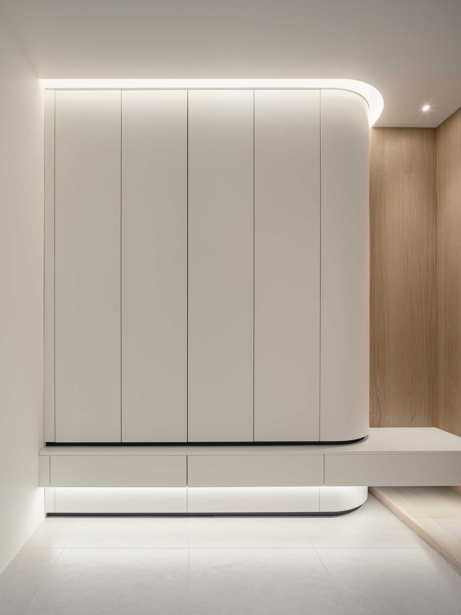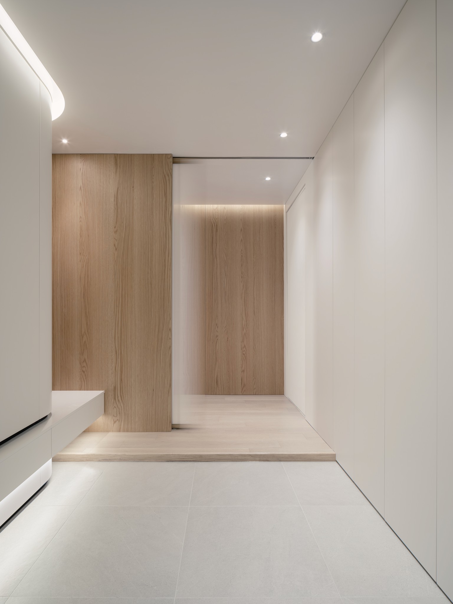 The space is organized by eliminating unnecessary elements and integrating walls and built-in furniture into a unified mass. Storage and functional components are concealed, allowing the interior to be perceived as a continuous surface and flow.
