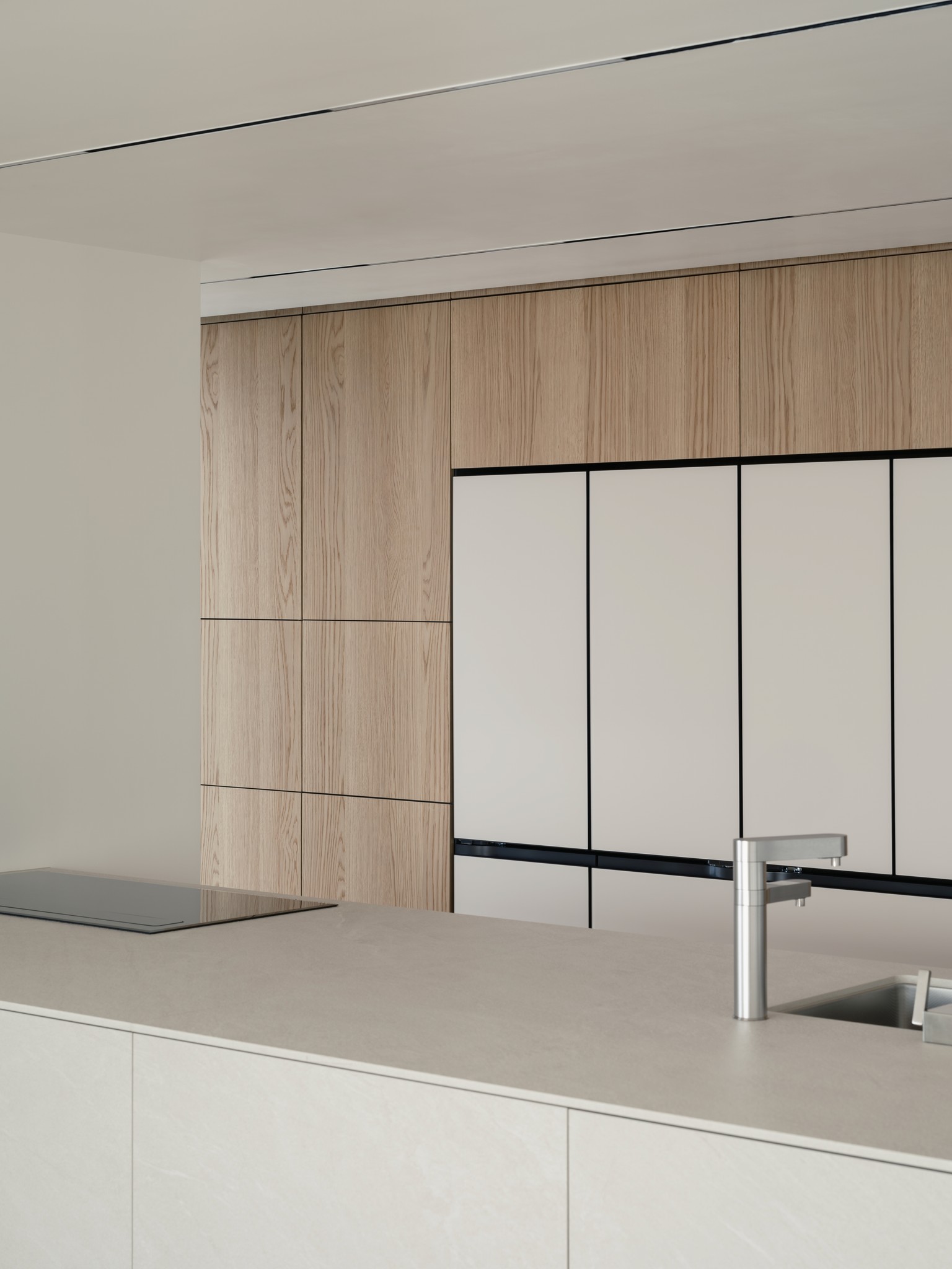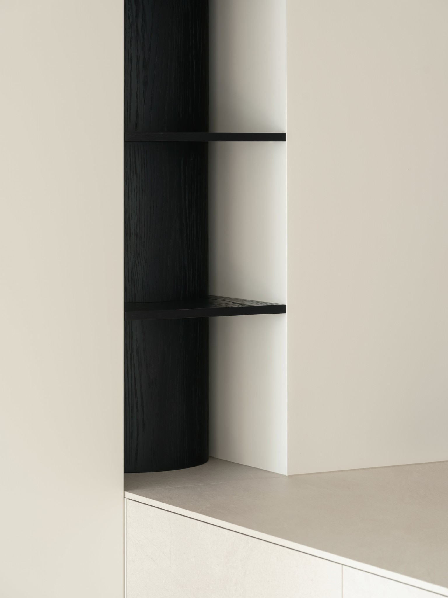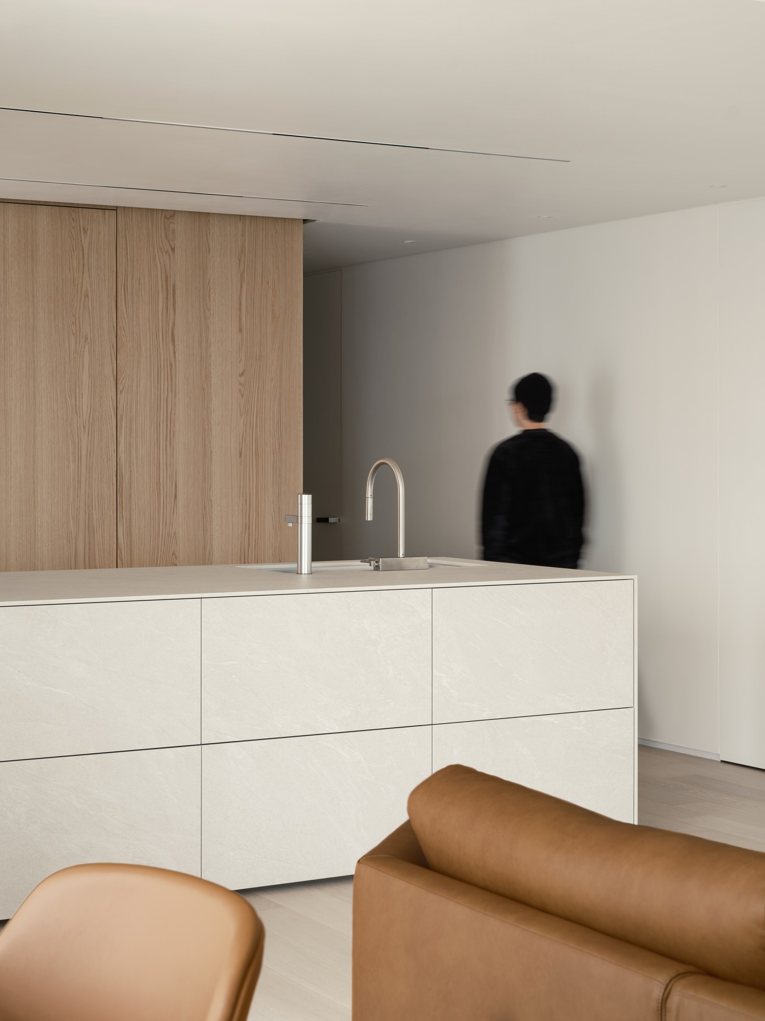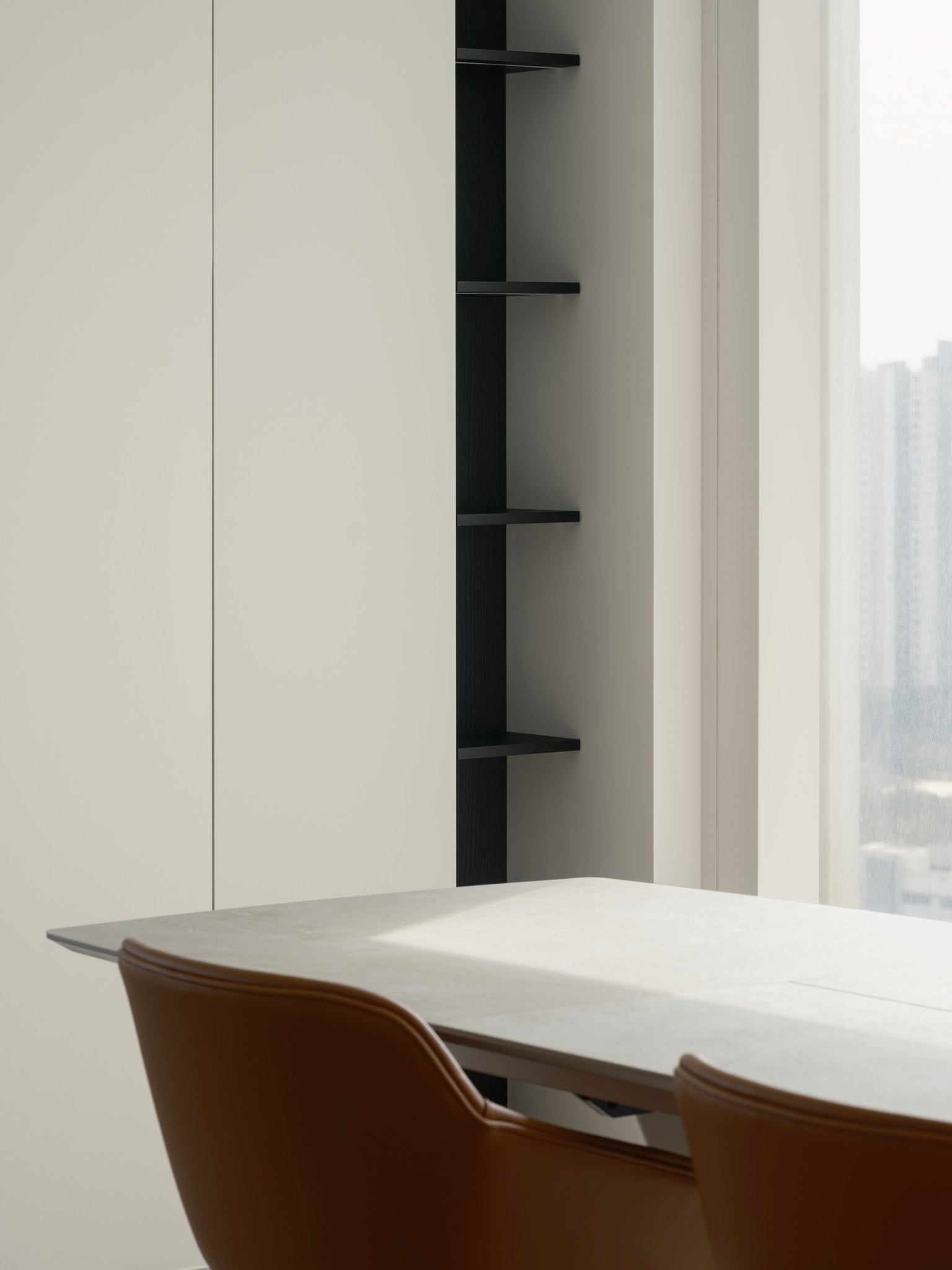 The space is organized by eliminating unnecessary elements and integrating walls and built-in furniture into a unified mass. Storage and functional components are concealed, allowing the interior to be perceived as a continuous surface and flow.