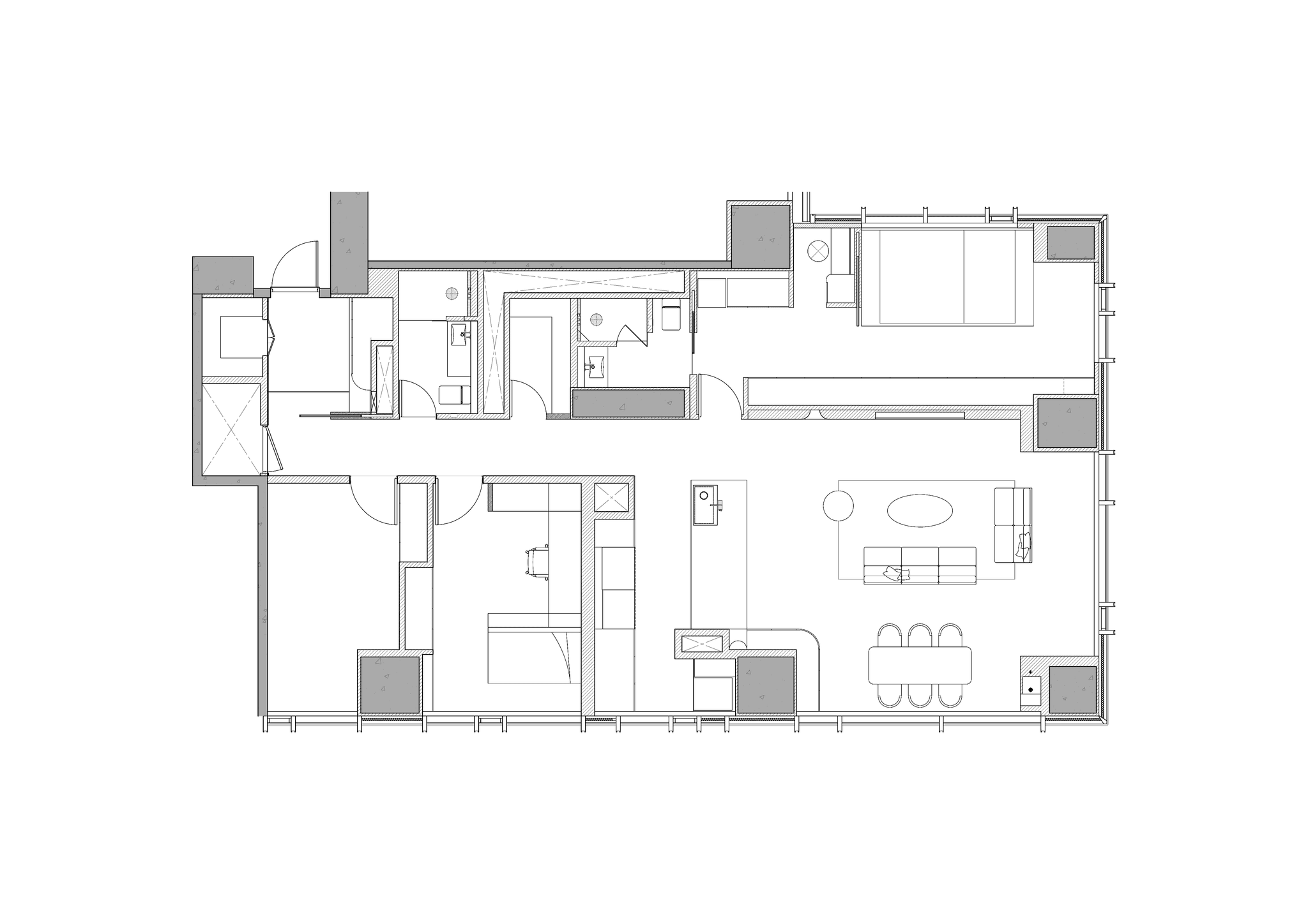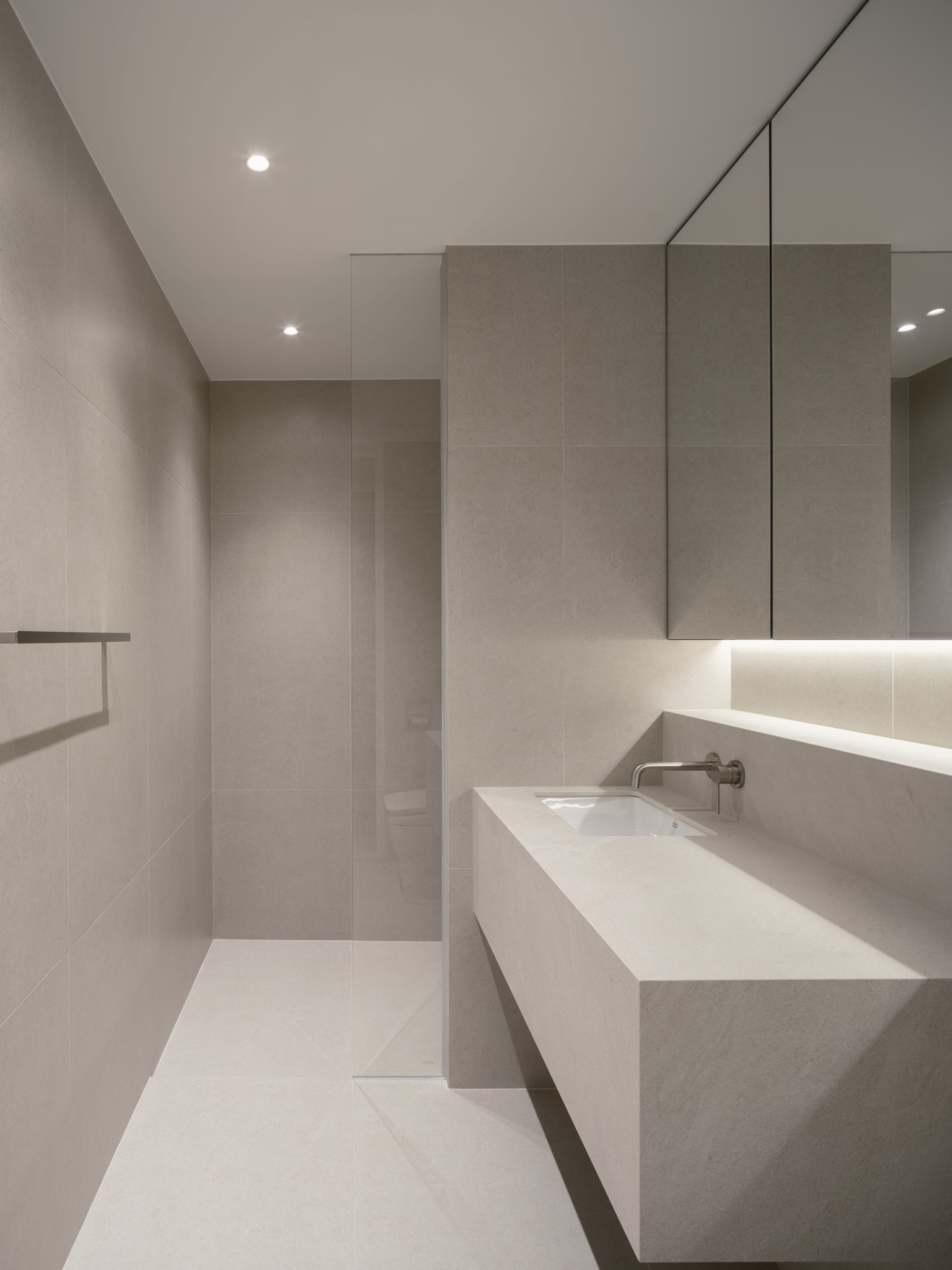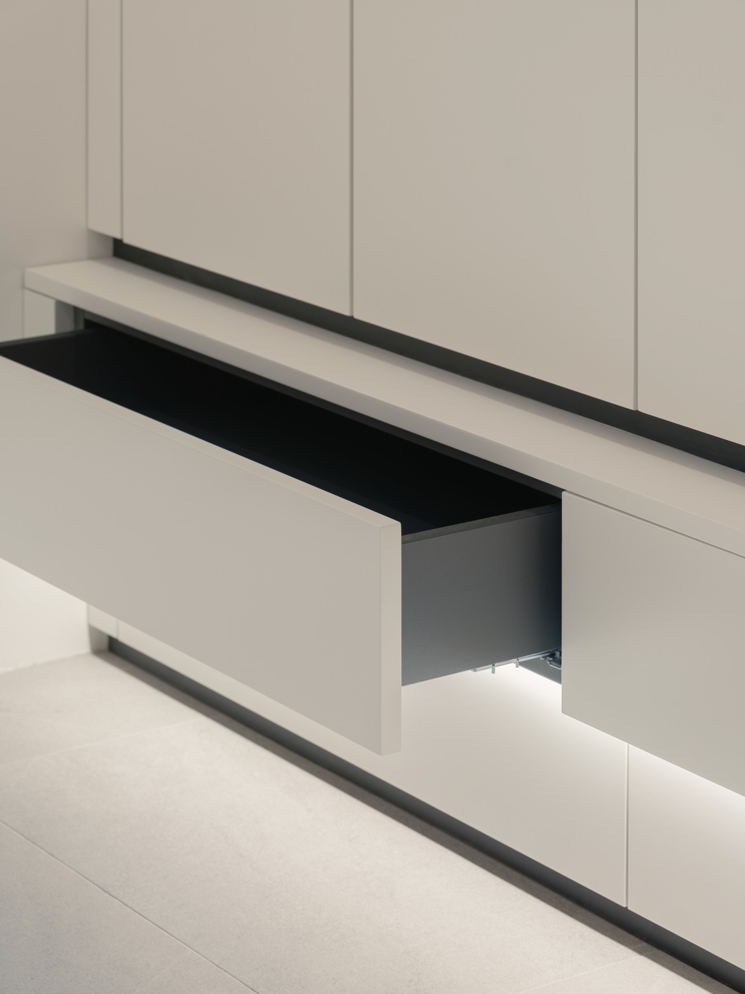 공간은 불필요한 요소를 배제하고, 벽체와 가구를 하나의 매스로 통합하여 구성된다. 수납과 기능은 외부로 드러나지 않도록 정리되며, 전체 공간은 하나의 연속된 면과 흐름으로 인식된다.