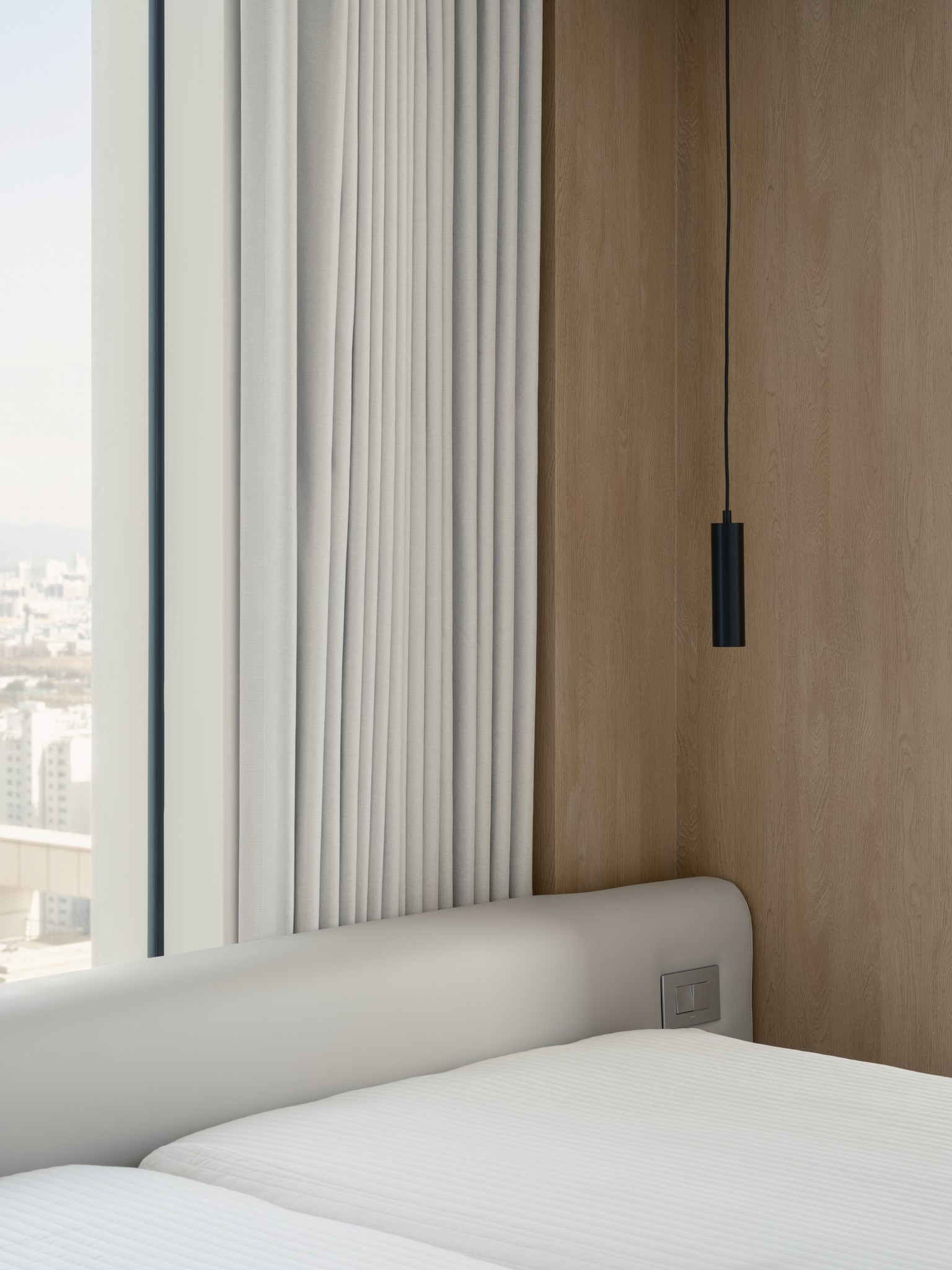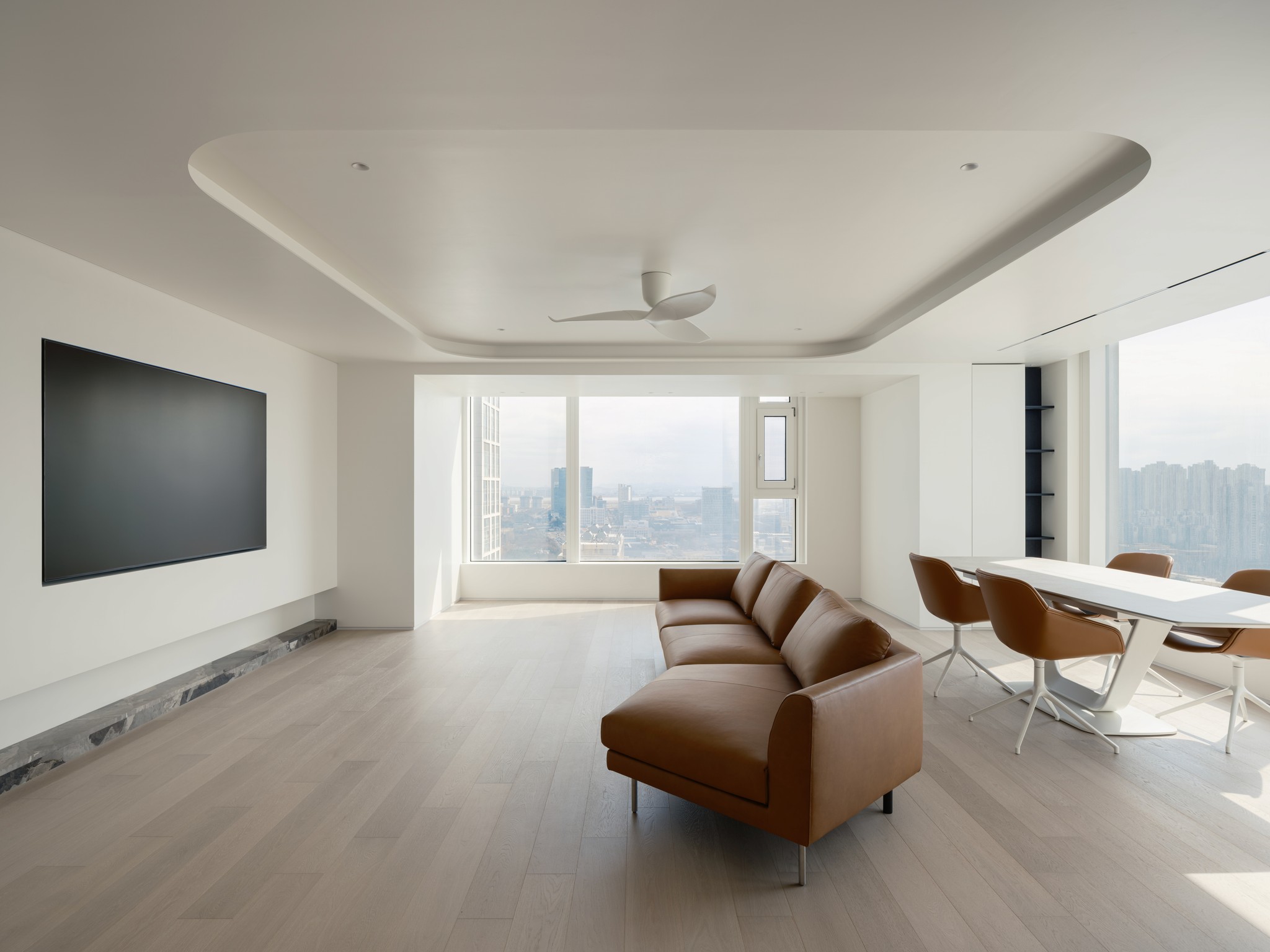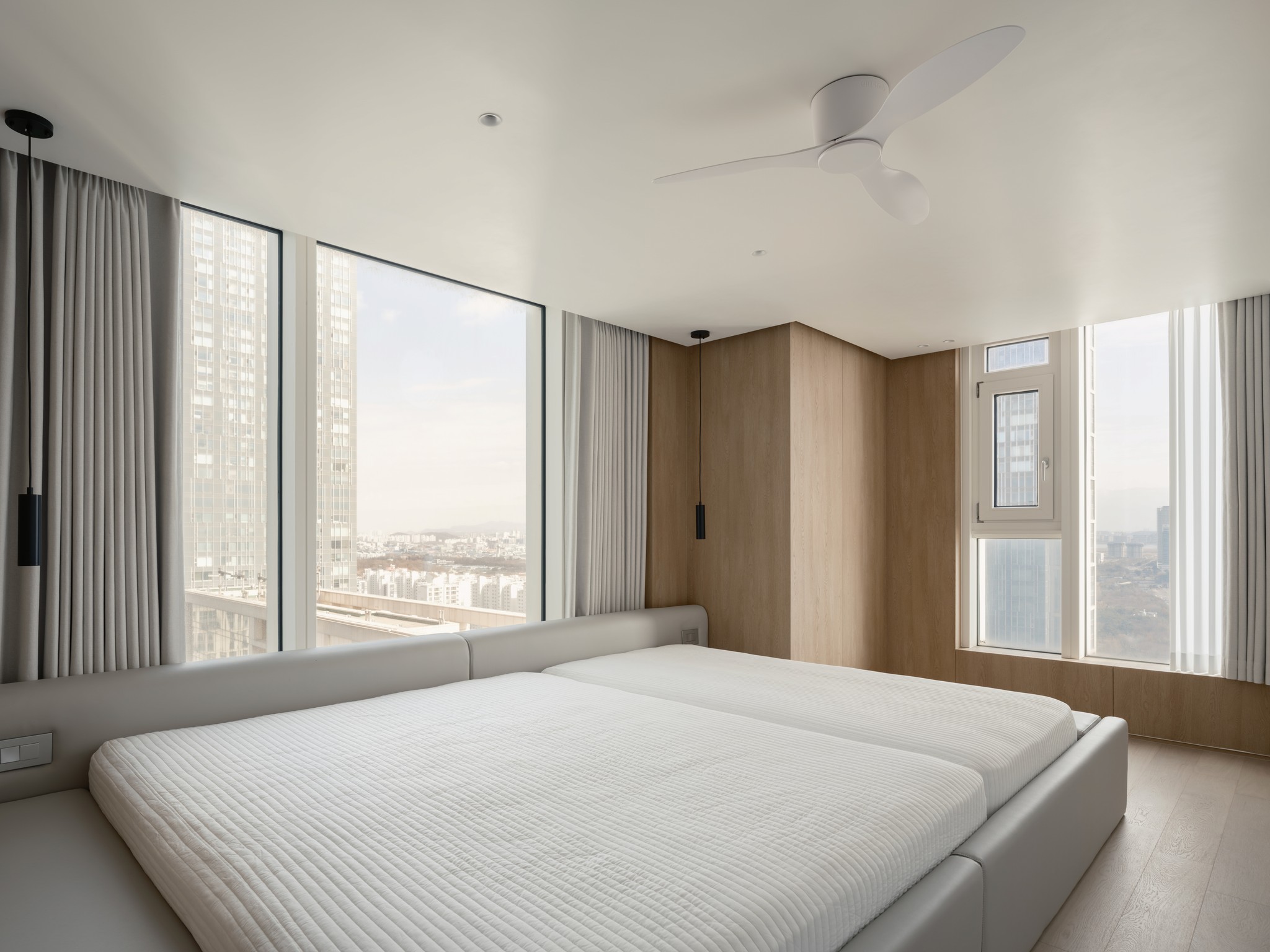 화이트를 중심으로 한 절제된 색채와 목재의 물성은 공간에 안정감을 부여하며, 과도한 표현 없이도 충분한 깊이를 형성한다. 큰 개구부를 통해 유입되는 자연광과 외부의 도시 풍경은 내부 공간과 유기적으로 연결된다.