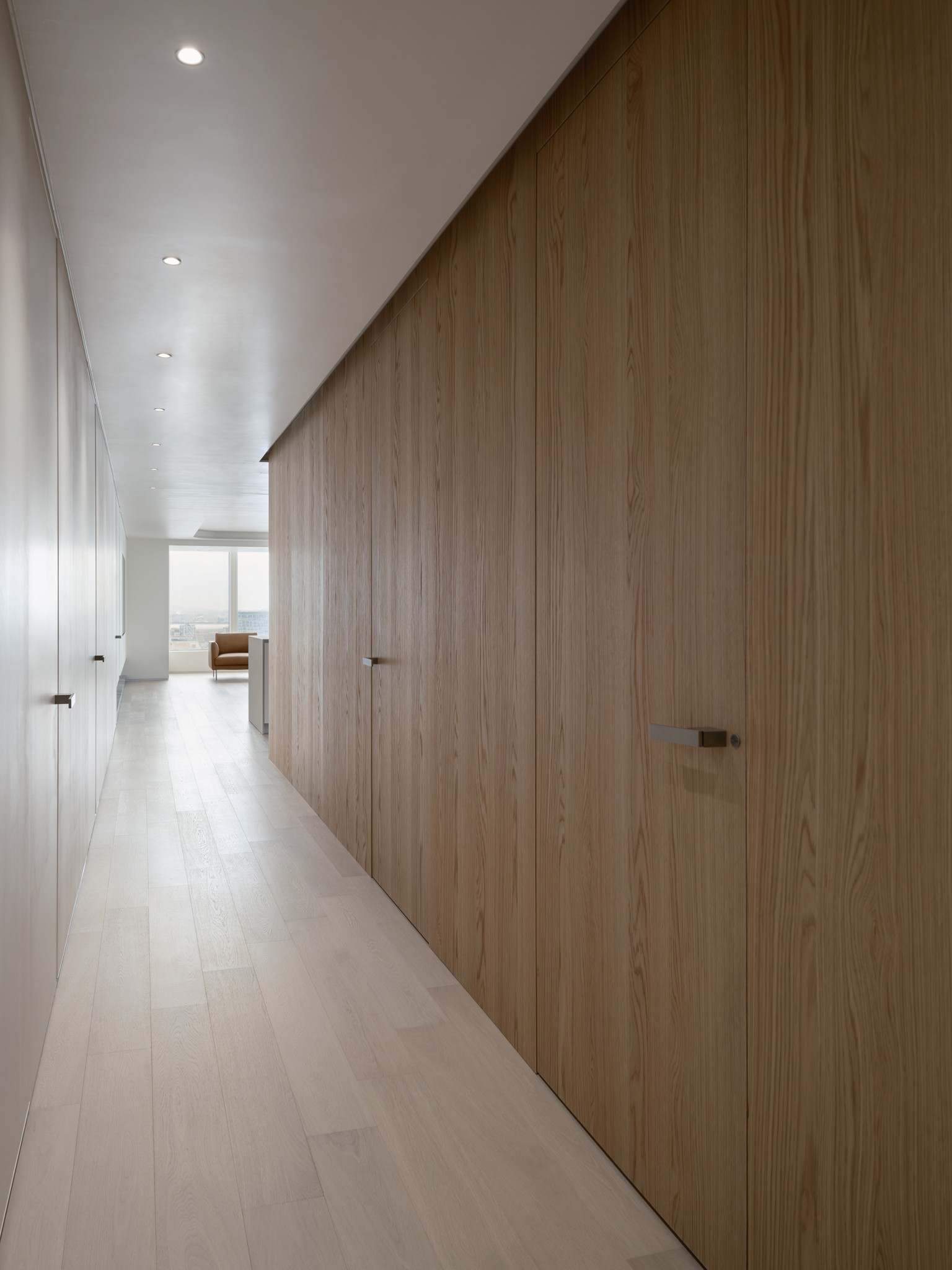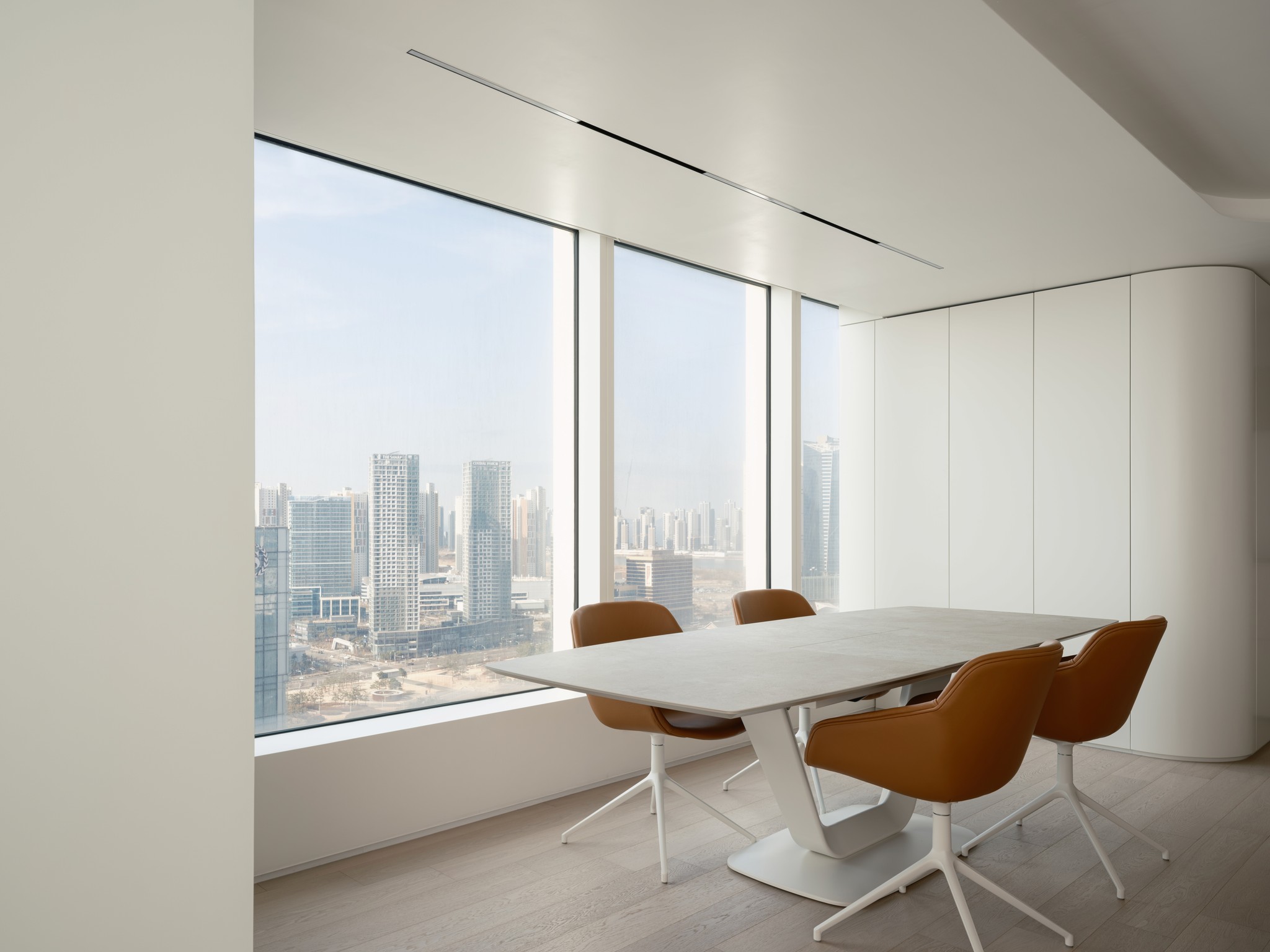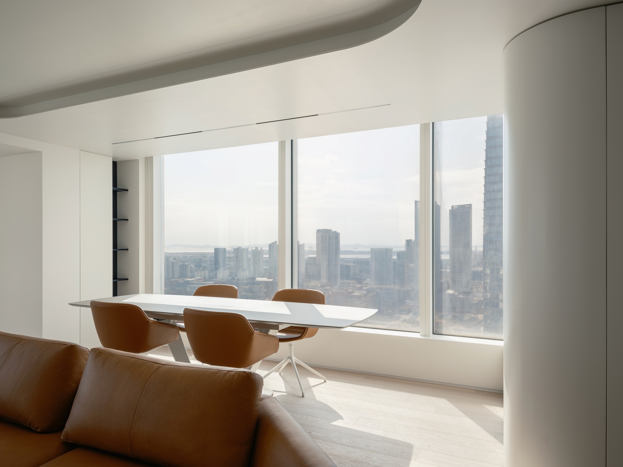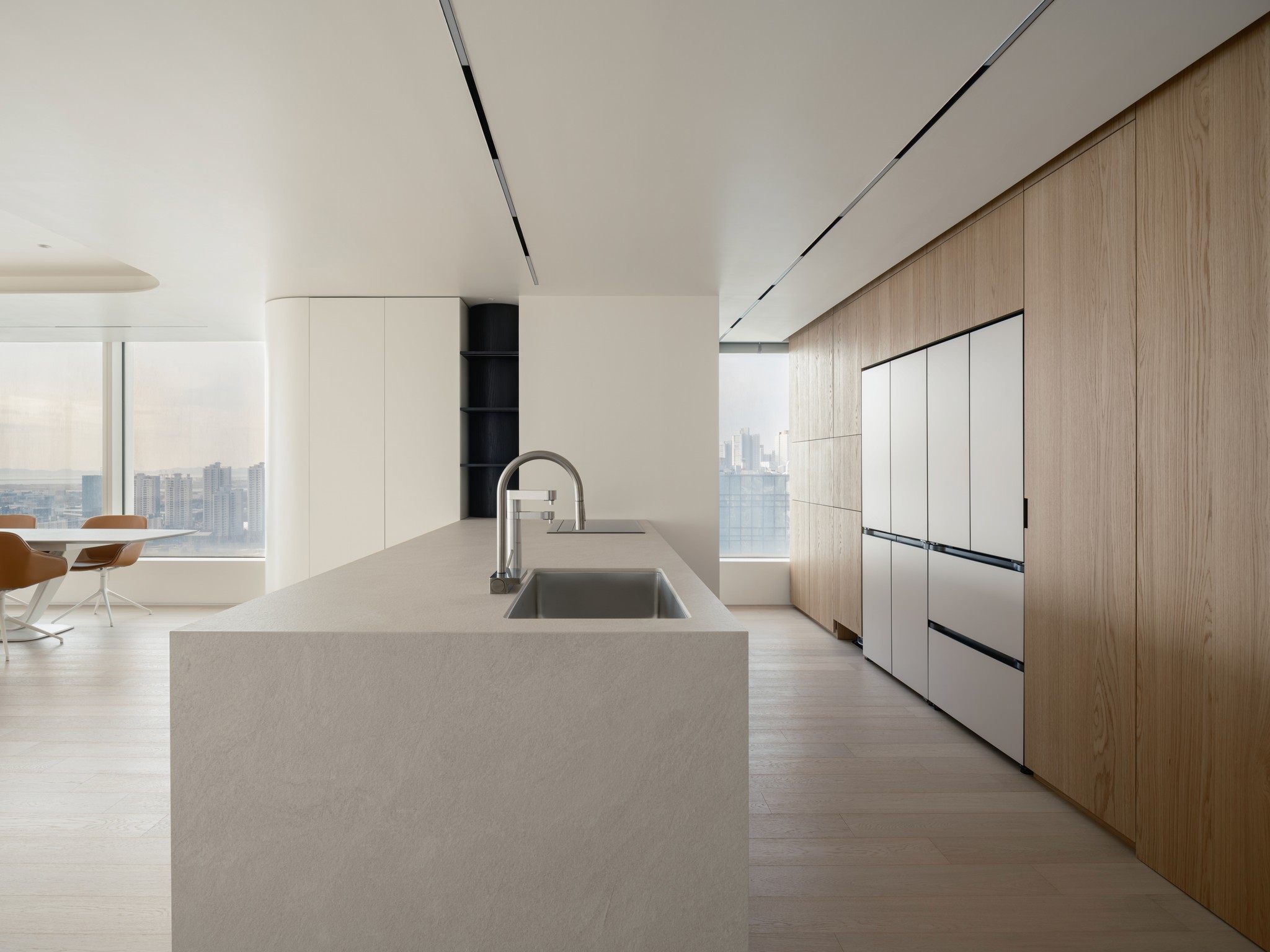 화이트를 중심으로 한 절제된 색채와 목재의 물성은 공간에 안정감을 부여하며, 과도한 표현 없이도 충분한 깊이를 형성한다. 큰 개구부를 통해 유입되는 자연광과 외부의 도시 풍경은 내부 공간과 유기적으로 연결된다.