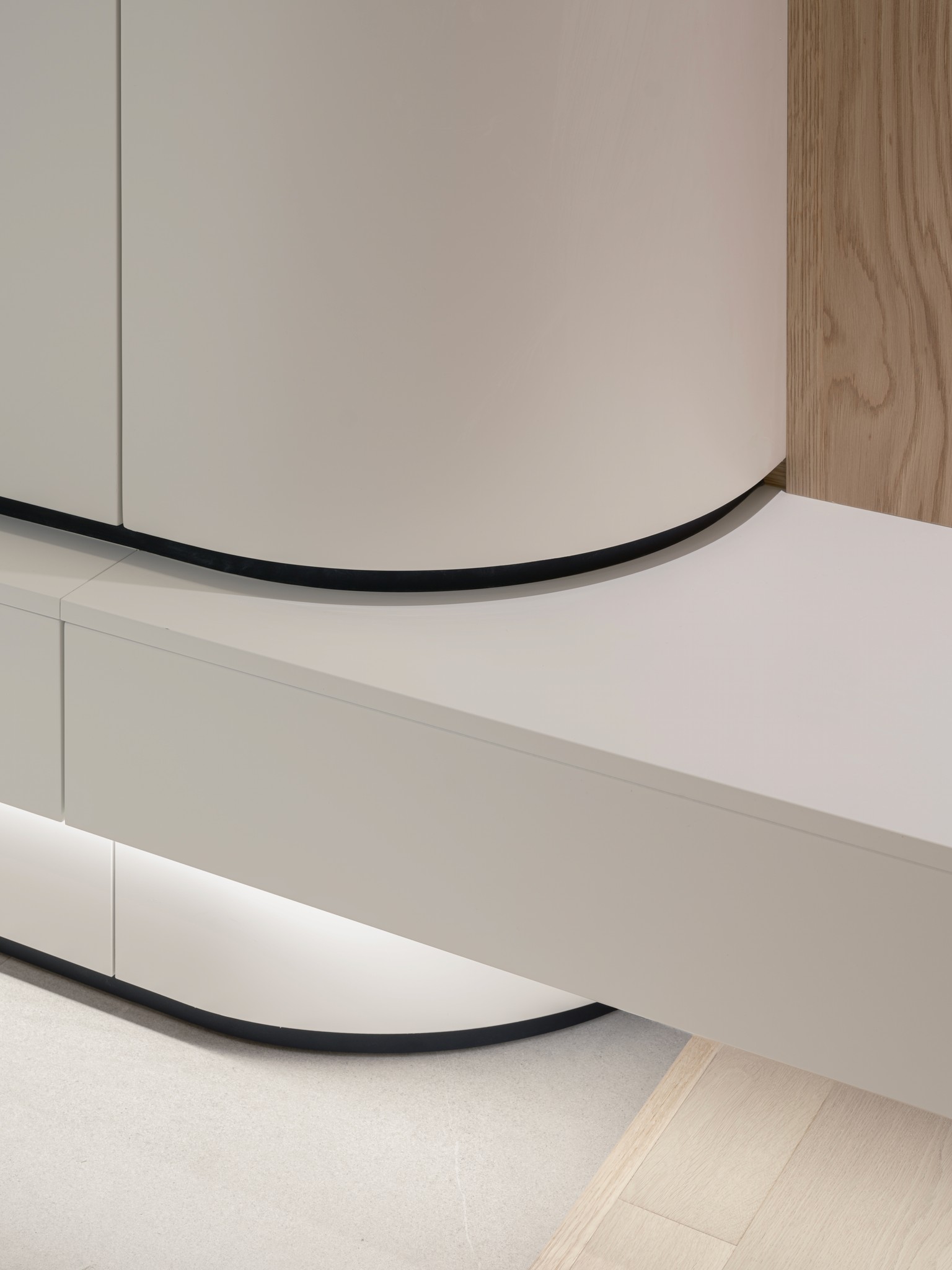 Rounded corners and softly curved ceiling lines ease spatial tension and guide movement naturally. These curved elements contrast with the linear structure, creating a balanced spatial composition.